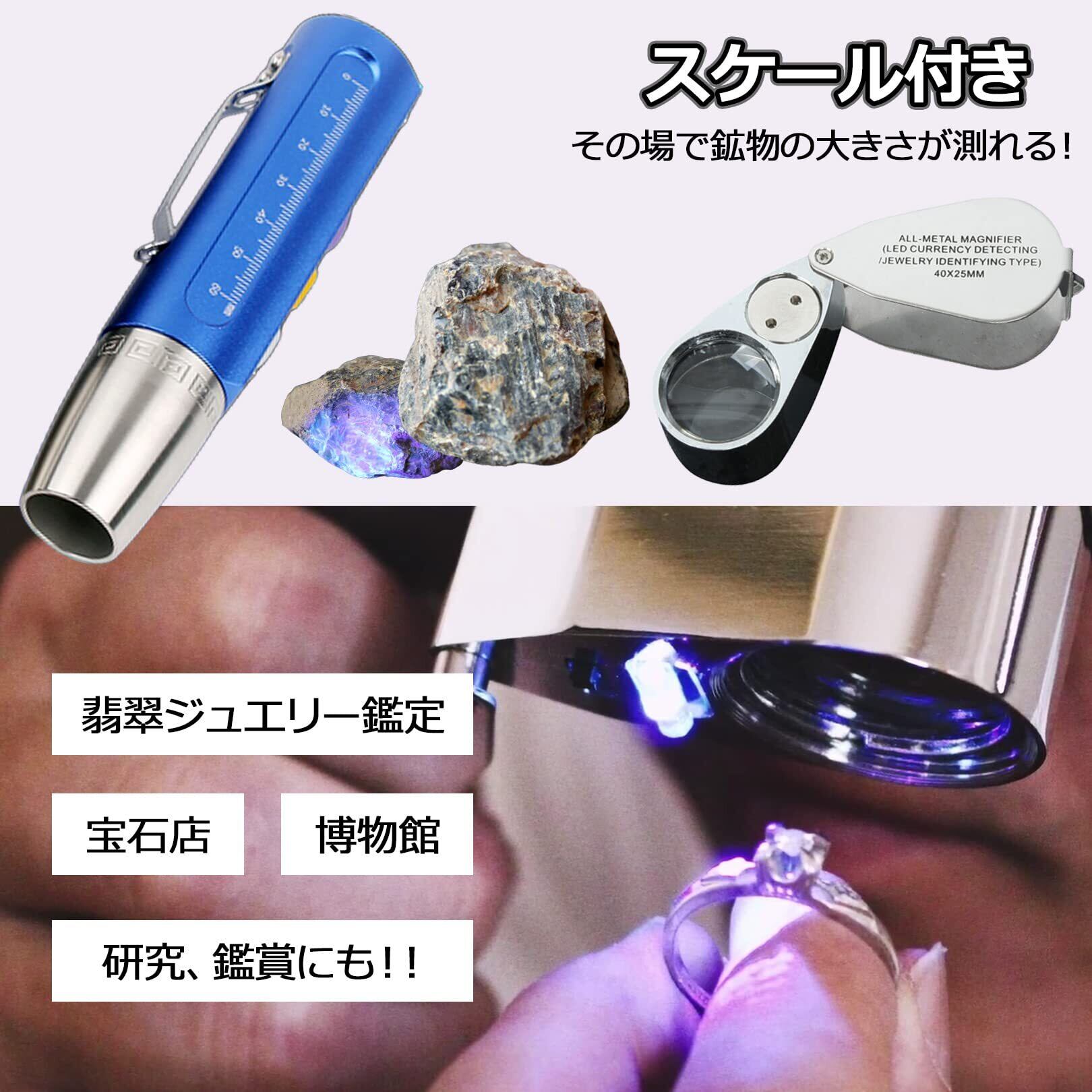 ヒスイ識別ライトはUSB充電式、本体は充電完了時グリーンに点灯。ヒスイに投射して使用。黄、白は長押しで明るさ調整可能。鉱石の大きさを測れる本体のスケール付き。ビジネス、研究、趣味まで幅広くお使い頂けます。