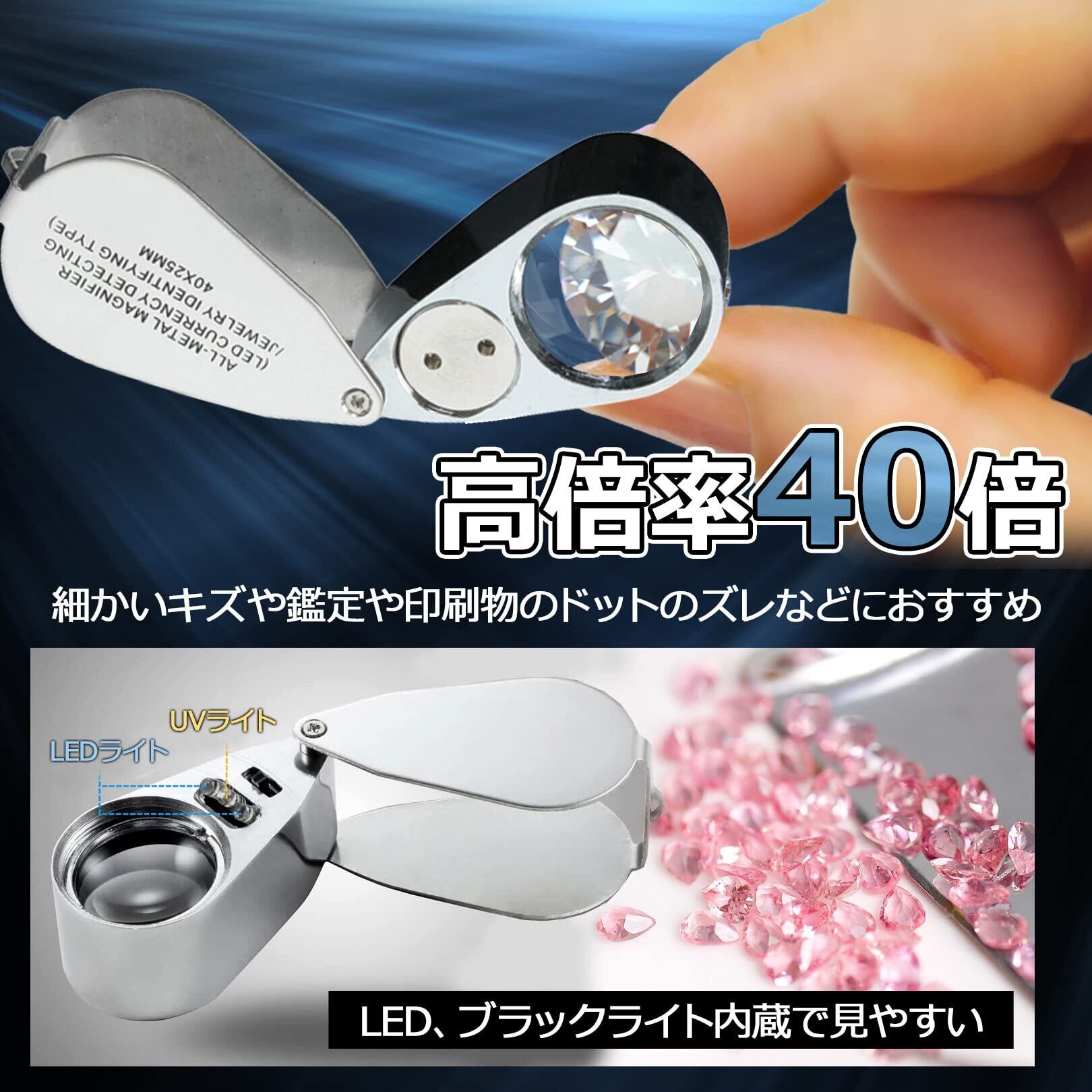 ルーペは、宝石などのアクセサリーなどの細かいキズや鑑定、印刷物のドットのズレ、アンティークグッズ、アート鑑賞などに適した高倍率の40倍。LED、ブラックライト内蔵、折り畳み式、携帯に便利な保護ケース付き。