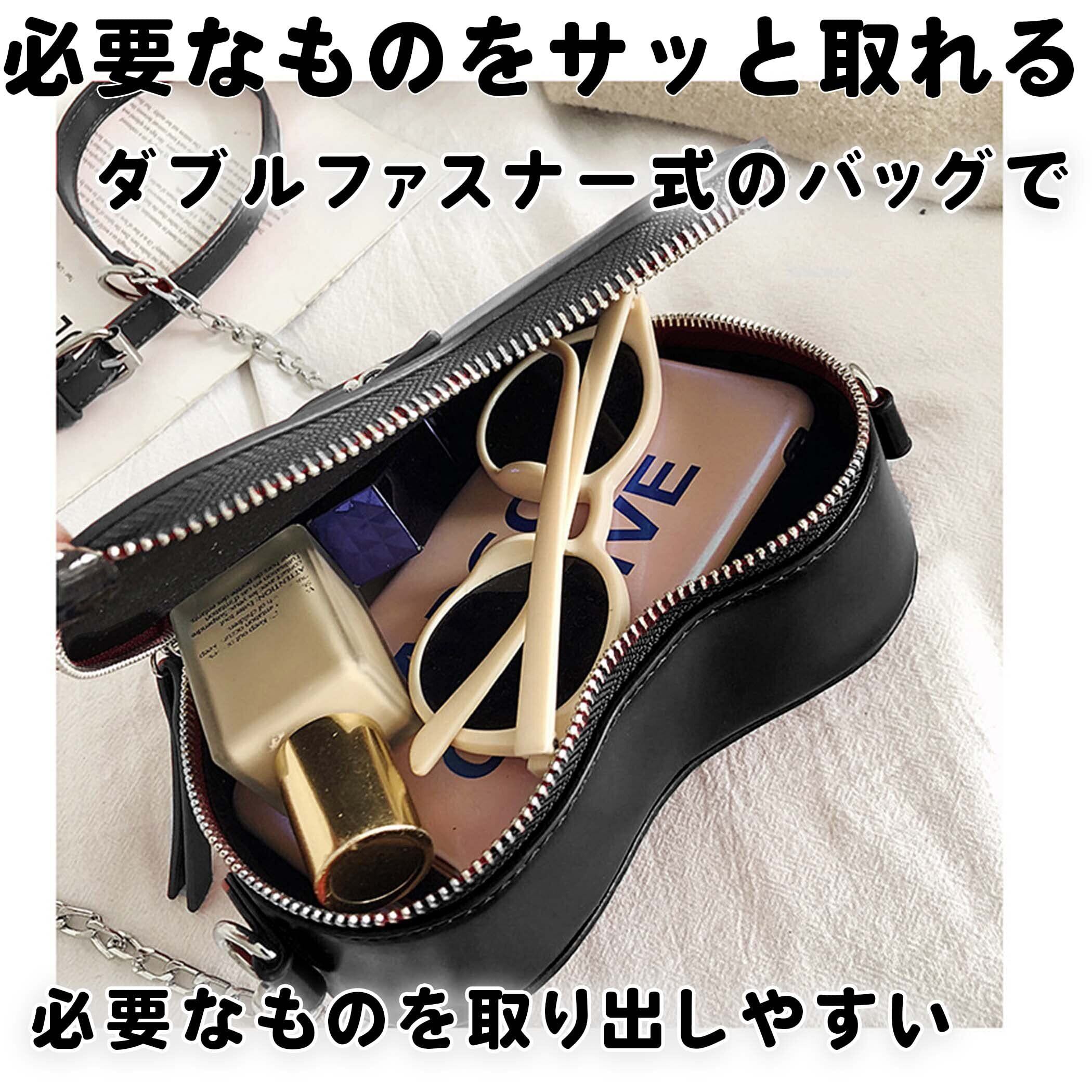 ハート型のショルダーバッグ:PUレザー生地を使ってつくられたコンパクトなサイズ感のショルダーバッグです。キュートなハート型のデザインが印象的で、写真映えもしやすいです。