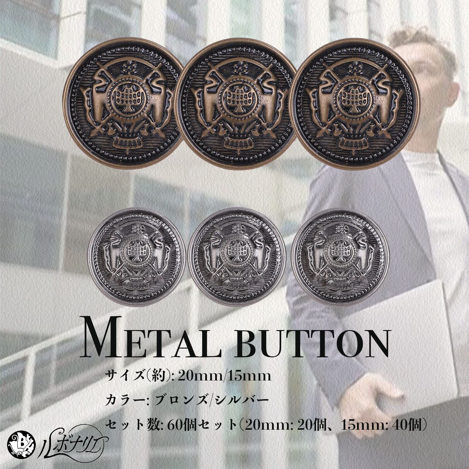 ジャケットのボタン交換に、とても便利なメタルボタン60個セットです。シルバーとブロンズをご用意致しましたので、お好みに合わせてお選びください。
