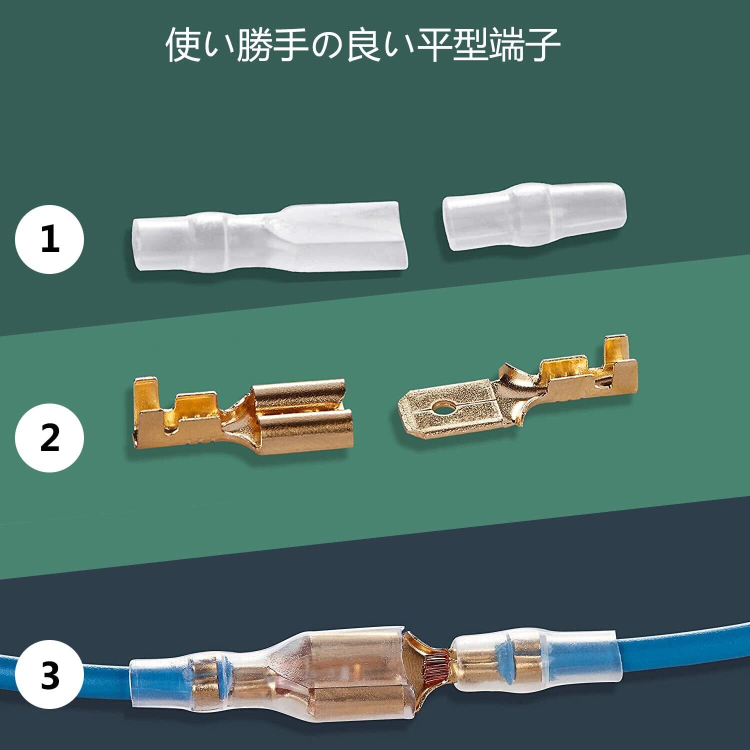 【使用簡単】まず、絶縁スリーブを電線に接続し、次にケーブルの両端にメスとオスの平型端子を繋げて組み合わせて使います。ご注意:専用の電工ペンチを使用して配線コードの接続を行います。