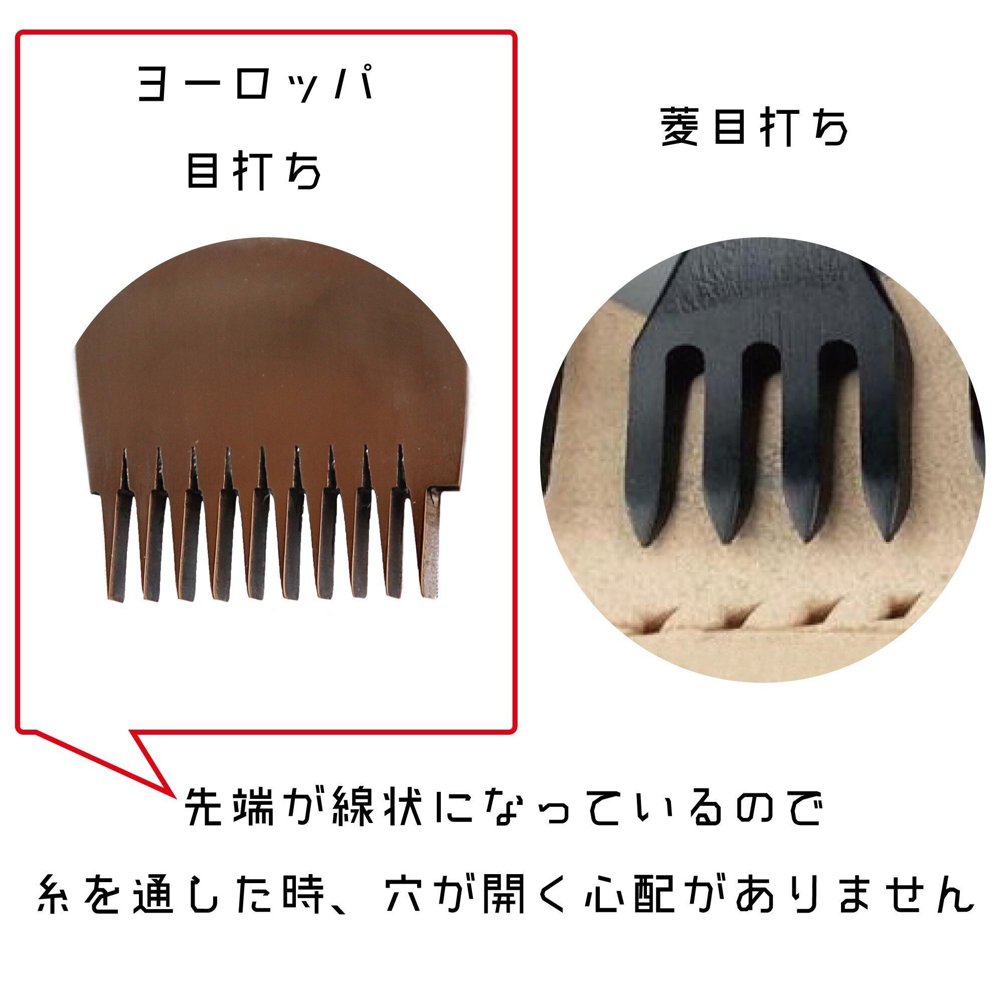 ヨーロッパ目打ちは先端の刃先が菱目打ちの点ではなく線の為、糸の角度が鋭角に傾き、斜めになります。目打ちの穴が大きいため針抜けがスムーズで作業の効率にも役立ちます。