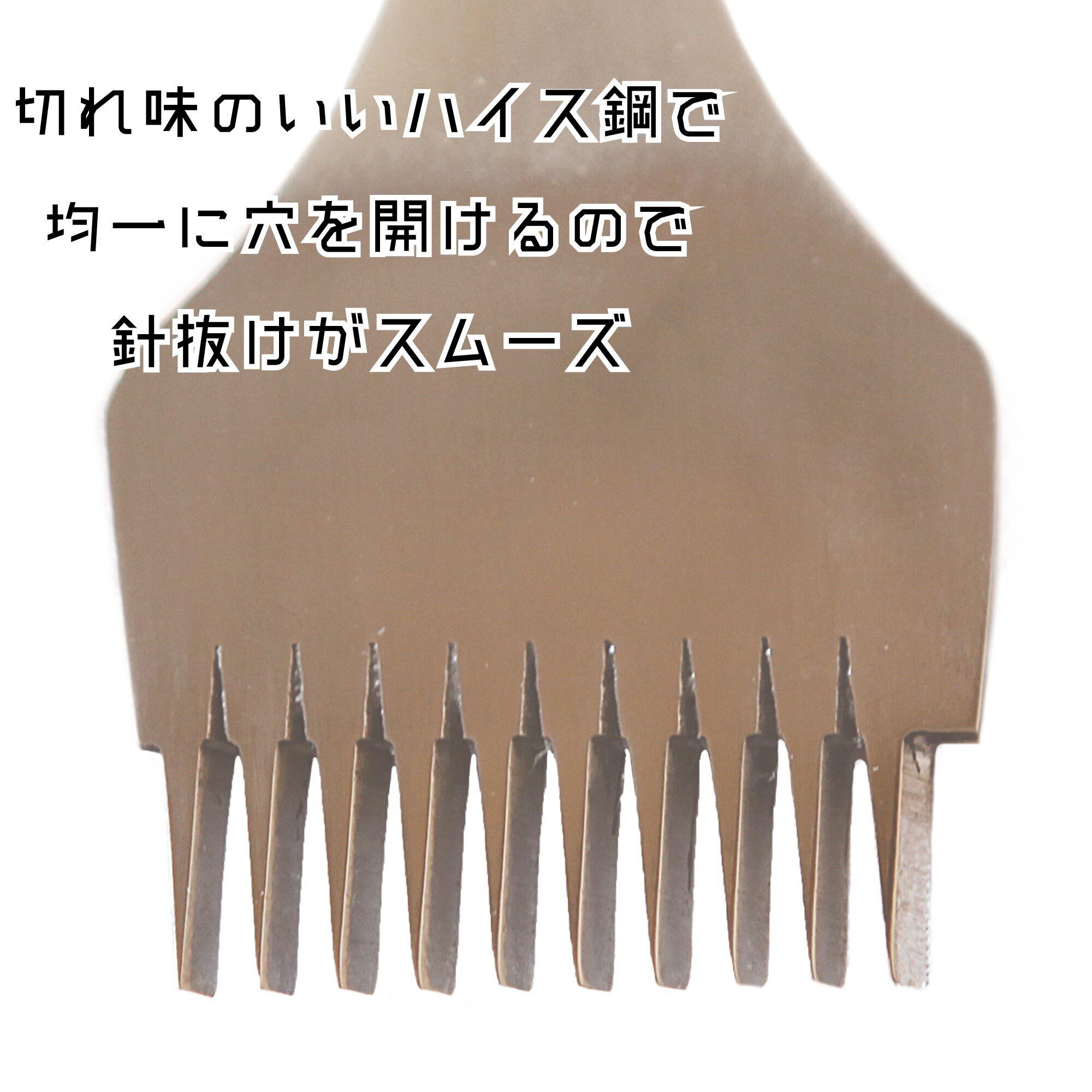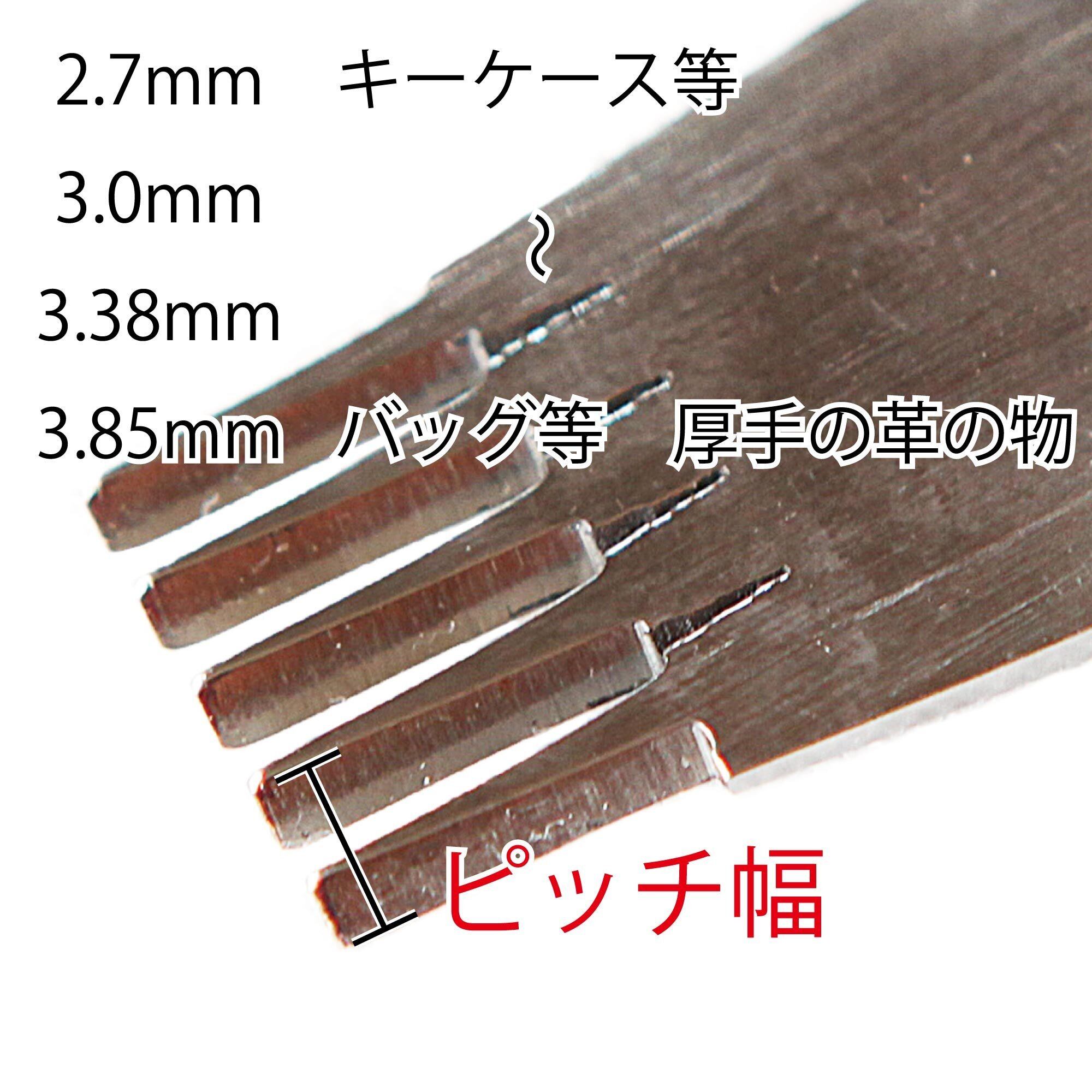 ピッチサイズが小さい程、革の薄い小物。大きい程、革の厚いバッグ等で分けるのが一般的です。又、目数は多いほど直線での作業効率優先、1,2本は曲線などの細かい部分で使分けると良いでしょう。使用後は手の汗などをふき取りミシン油、CRC等のやわらかい油をぬって保管して下さい。錆を防ぎ長持ちします。