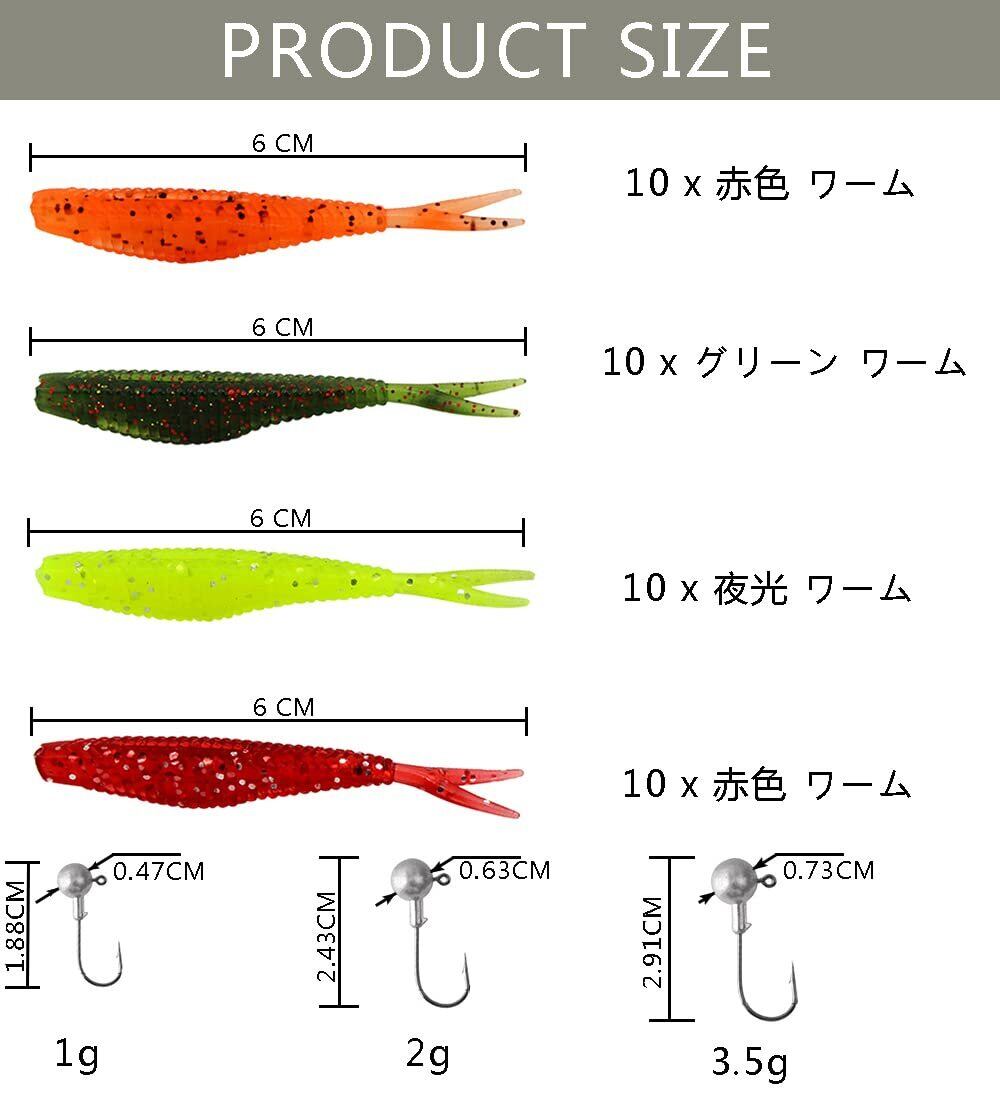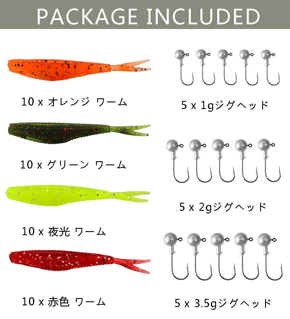 【55本セット内容】パッケージには、4色のアジングワーム(オレンジ/赤/黄/グリーン)40個と3サイズのジグヘッド(1g/2g/3.5g)15個が入っています。豊富な色はあらゆるの天候と水域に対応できます。