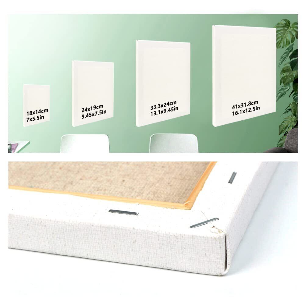 【16枚セットで描き放題】:セットには4サイズが選択可、各サイズは4枚あり、 全部16枚があって便利です。発送の便利さのために、キャンバスははめ込まれて包装しています。ご了承ください。綿化繊混紡とライト木枠を採用しており、丈夫で変形しにくい。保護フィルムで丁寧に包まれており、張りキャンパスをしっかり保護しています。