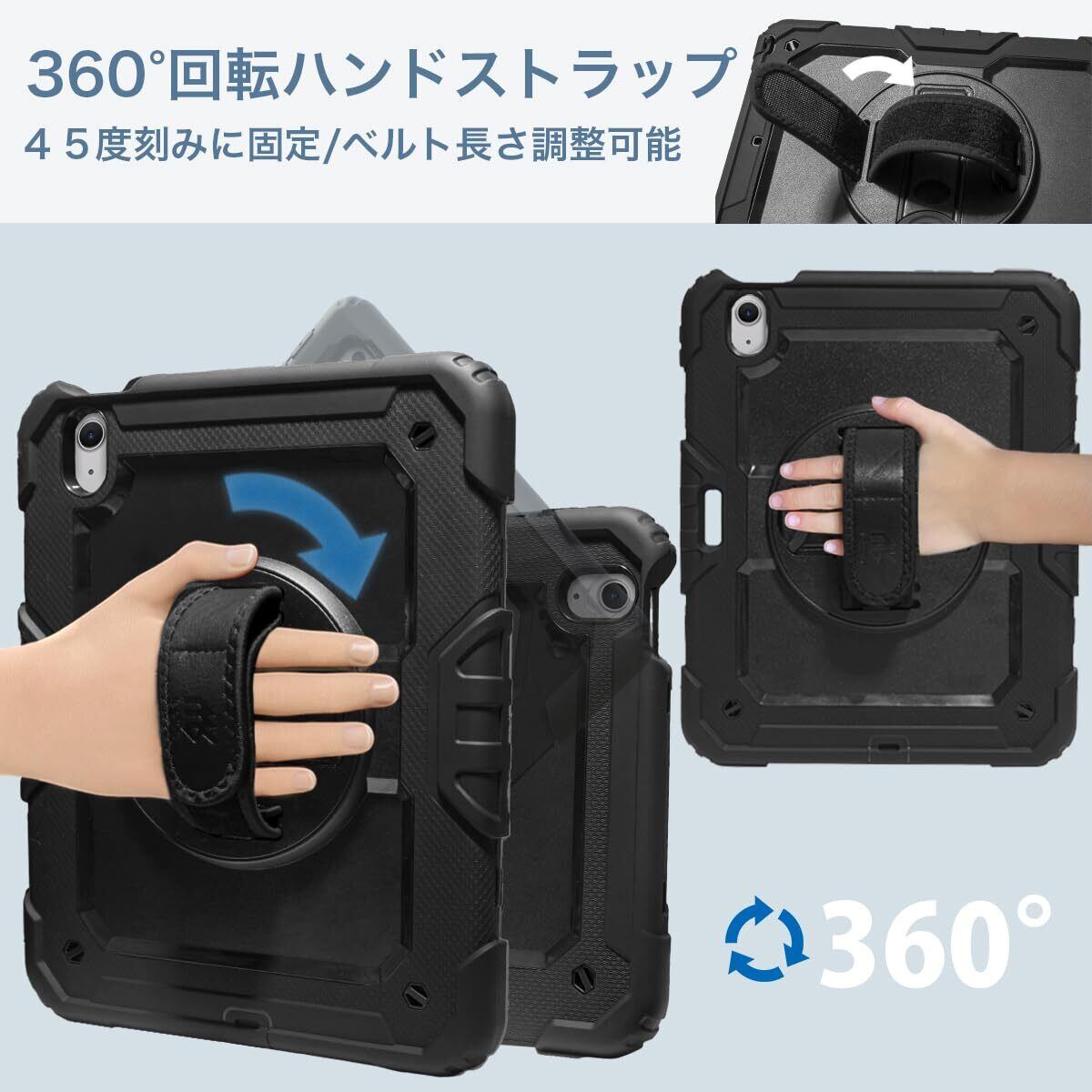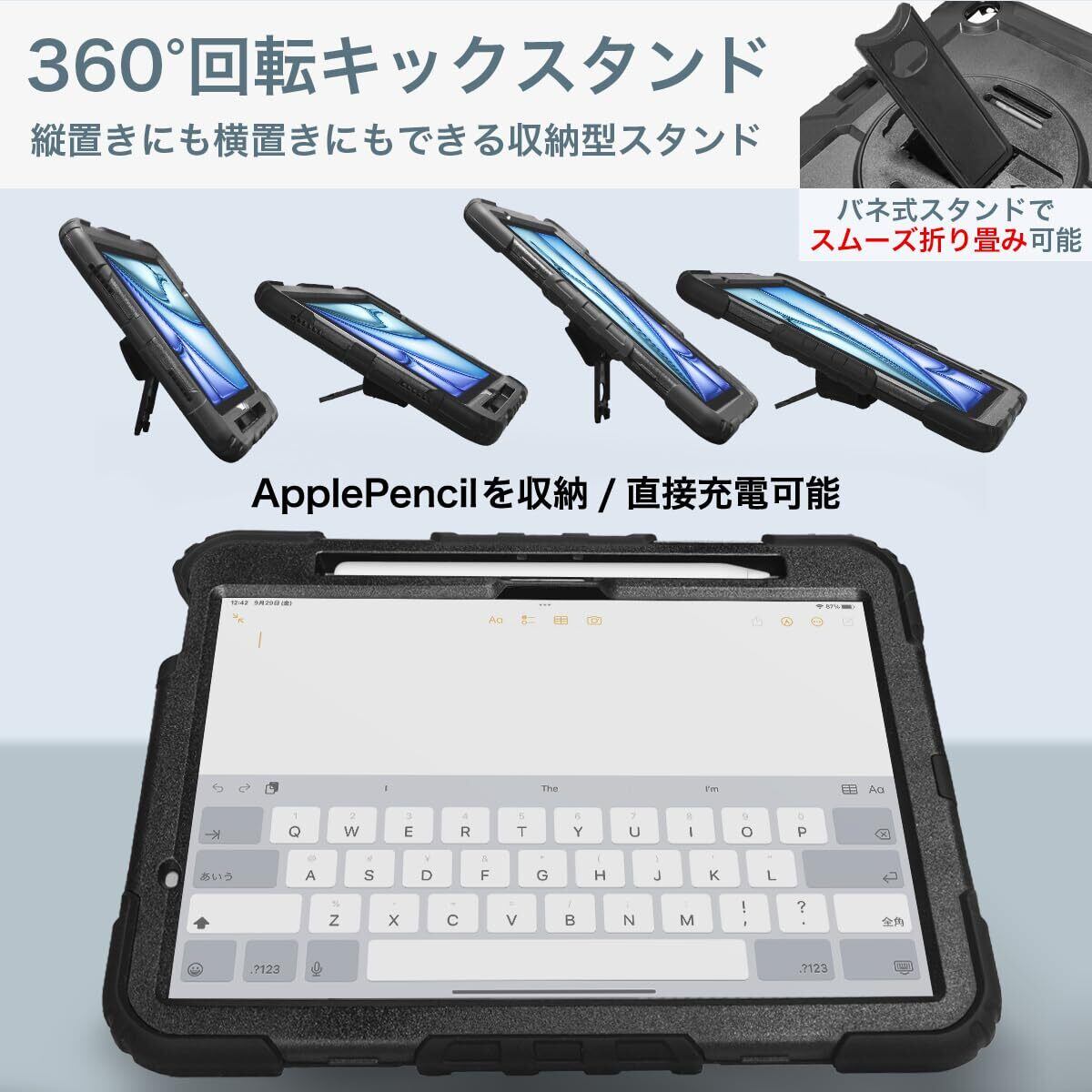 iPad Air 11インチ M3チップ 2025年モデル / M2チップ 2024年モデル 対応 耐衝撃 保護フィルム付き 360°回転スタンド ストラップ ケース