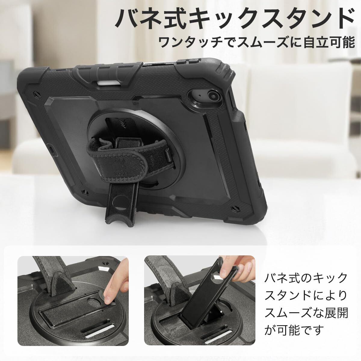 360°回転式の スタンド 背面のハンドストラップ ショルダー ストラップ で多様なシーンで使い分けることが可能