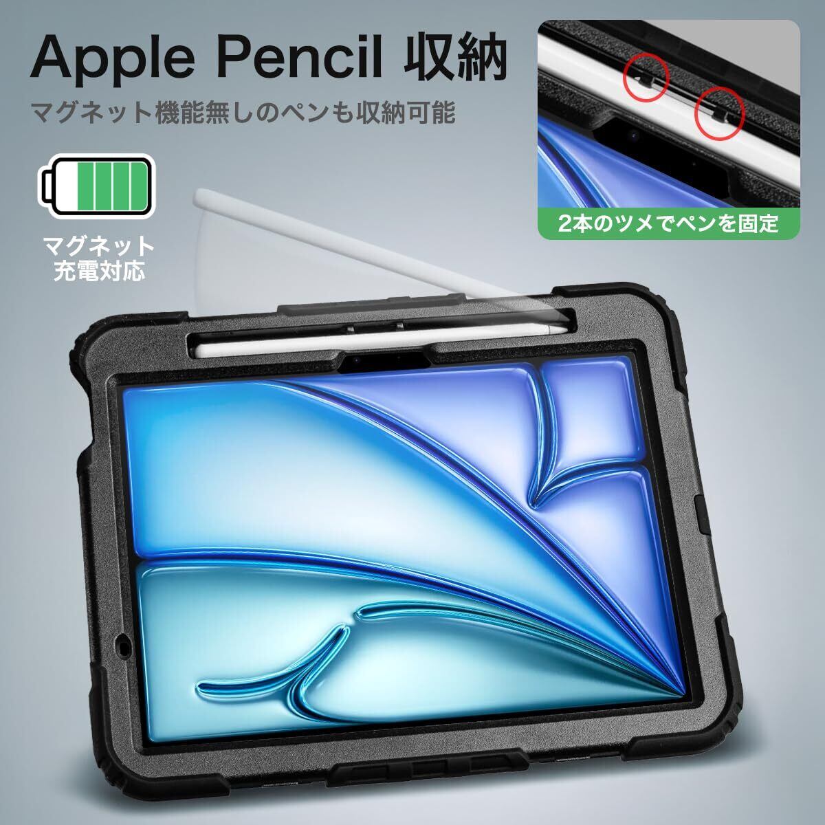 ◆【 Apple Pencil 充電対応+ペン収納 】 ◇ ペンホルダー部分にペンを収納したままで、Apple Pencil Pro または Apple Pencil(USB-C)を充電対応 ◇ ペン収納部分の2本のツメでペンをしっかり固定します。ペンシル取り出し用の穴があるので簡単にペンを取り出す事もできます。 ◇ マグネット装着非対応の直径9mm程度のペン収納も可能 ◇ ケース背面にもループ状のペンホルダーがありますので充電したくない場合やApple Pencil 以外のタッチペンも収納可能 ( ケース背面のペンホルダーは、グリップが付いていない 直径9mm程度のタッチペンの収納が可能です。グリップなどラバー素材はペンホルダーに差し込めませんのでご注意ください) ◆【 素材 】ケース:ポリカーボネート(PC) フレーム:シリコーン ◆【 サイズ 】縦27.1×横21.5×厚さ3.1(cm) 背面ハンドストラップを除く厚さ2cm <重量>約416g ※ショルダーストラップを除く重さ 【MS factory(R) 正規品】 ※iPad本体・Apple Pencilは付属しません。