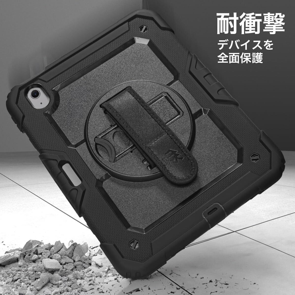 MS factory iPad Air 11インチ ケース M3 (2025) M2 (2024) 用 耐衝撃 保護フィルム付き ペン収納 アイパッドエアー カバー キッズ 頑丈 ショルダー ハンドストラップ 360°回転 スタンド ブラック 黒 IPDA11m2-SHOCK-BK