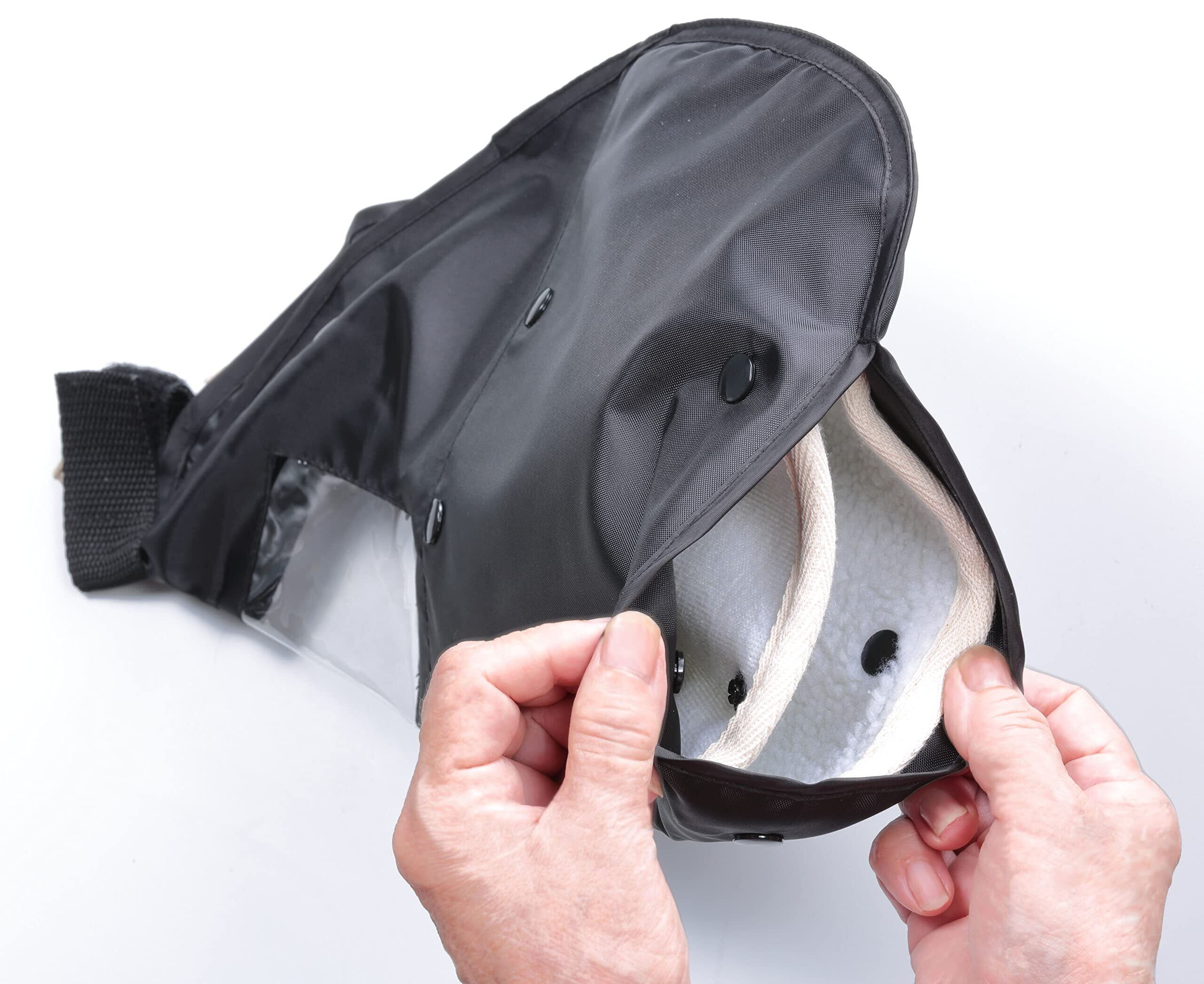 今までのヒモ取り付け式から装着しやすい面ファスナー付きベルト装着式に改善 透明窓付きだから電動アシスト自転車や変速機自転車にも対応 UVカット率:ブラック99.8% ブラウン94.6% ボアはボタンで簡単に取付け、取り外すことができるので、寒い季節はもちろん防寒対策として。暑い時期には雨やUV対策としても一年中使用していただけます。 雨でも安心はっ水加工