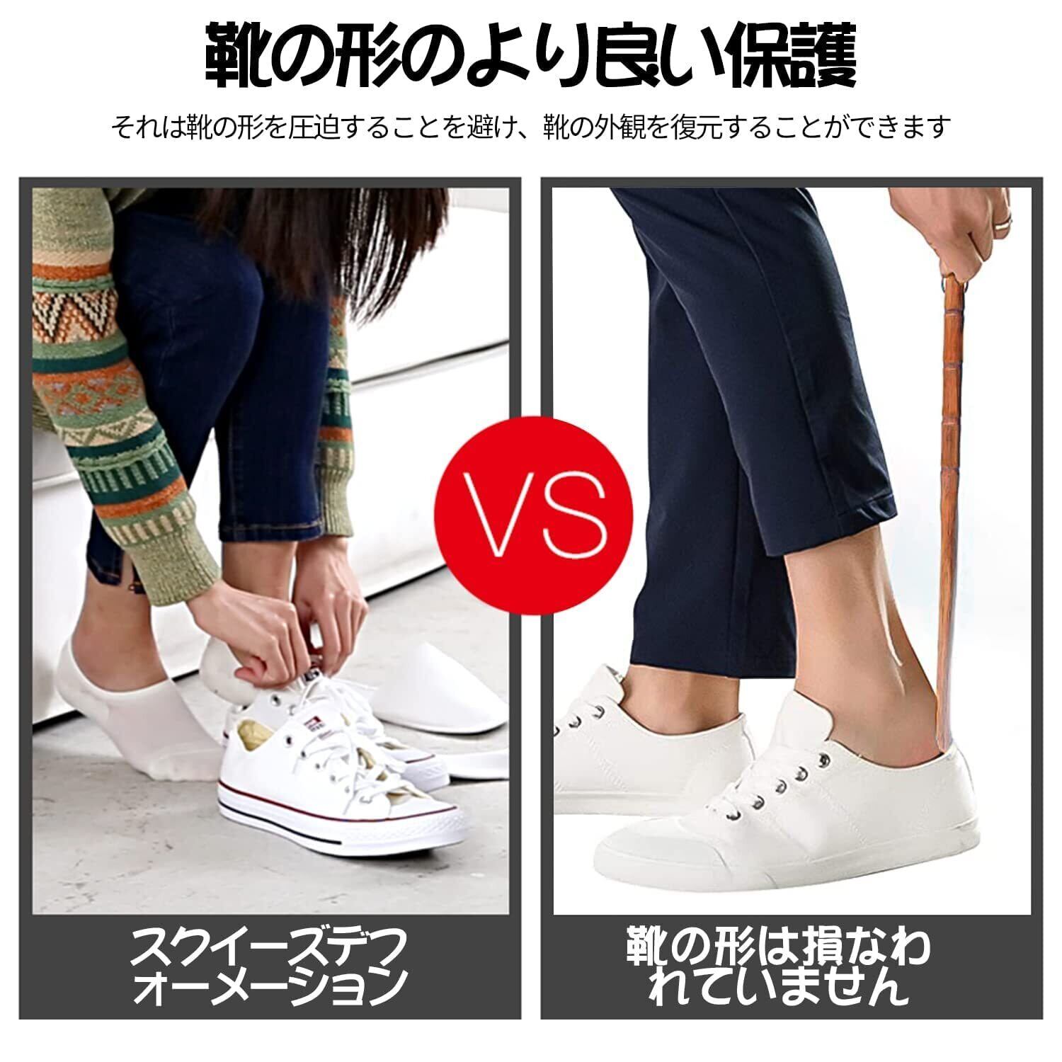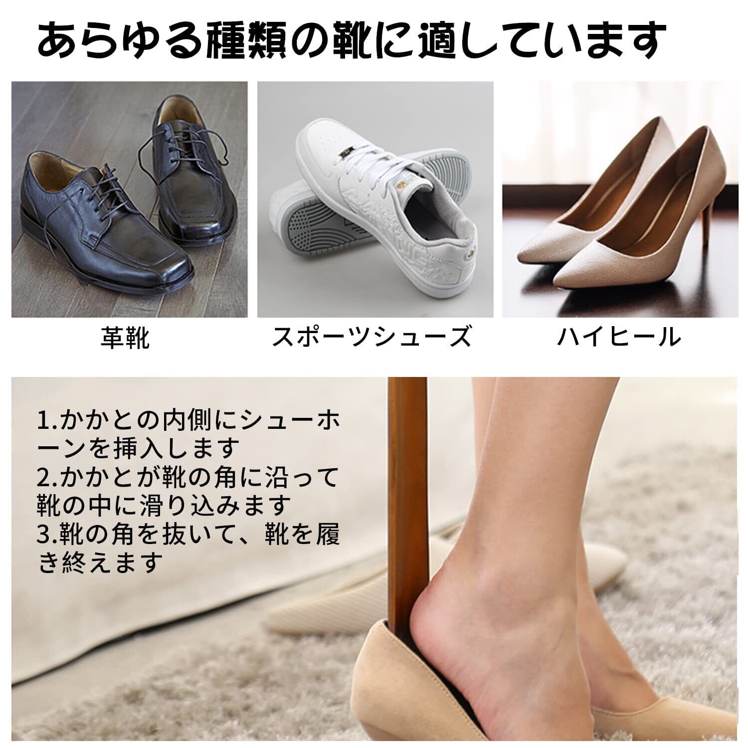 【使い方】足を靴の半分に入れ、アッパーをかかとの後ろに置き、直接靴に入れます。アッパーの力で足を靴に入れてから、アッパーを取り出します。