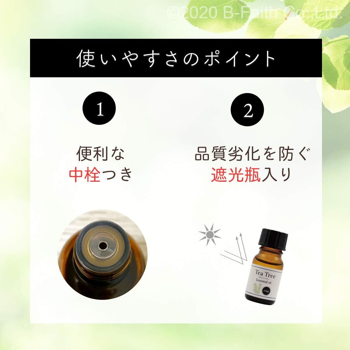 ティーツリーオイル【学名】Melaleuca alternifolia 【内容量】10mL【原産国】オーストラリア【充填】日本【抽出方法】水蒸気蒸留【抽出部位】葉