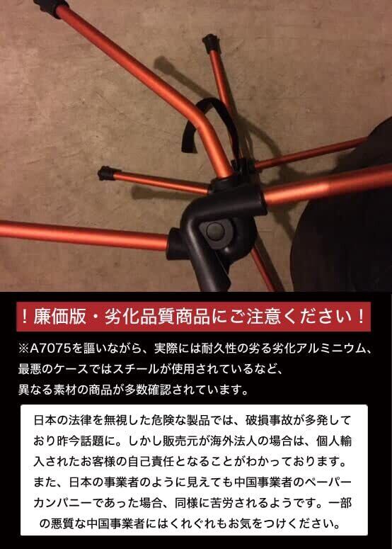 【 廉価版・劣化品質版商品にご注意ください 】現在アウトドアチェアの業界は、個人や海外業者の乱立により耐荷重・素材や仕様、安全性を偽った商品が溢れ、いわば"言った者勝ち"の無法地帯になっています。A7075を謳いながら、実際には耐久性の劣る劣化アルミニウム、最悪のケースではスチールが使用されているなど、異なる素材の商品も多数確認されています。永久保証を謳いながら国内に法人を持たないため、返品、交換、修理などの手続きが非常に難しい。または実際には保証を受けることが不可能なケースも散見されます。 ●当店は輸出入符号取得済み、国内PL保険加入済みの日本法人ですので、保証面でも安心していただくことができます。おかしな日本語の説明文やサクラレビューには十分ご注意ください。