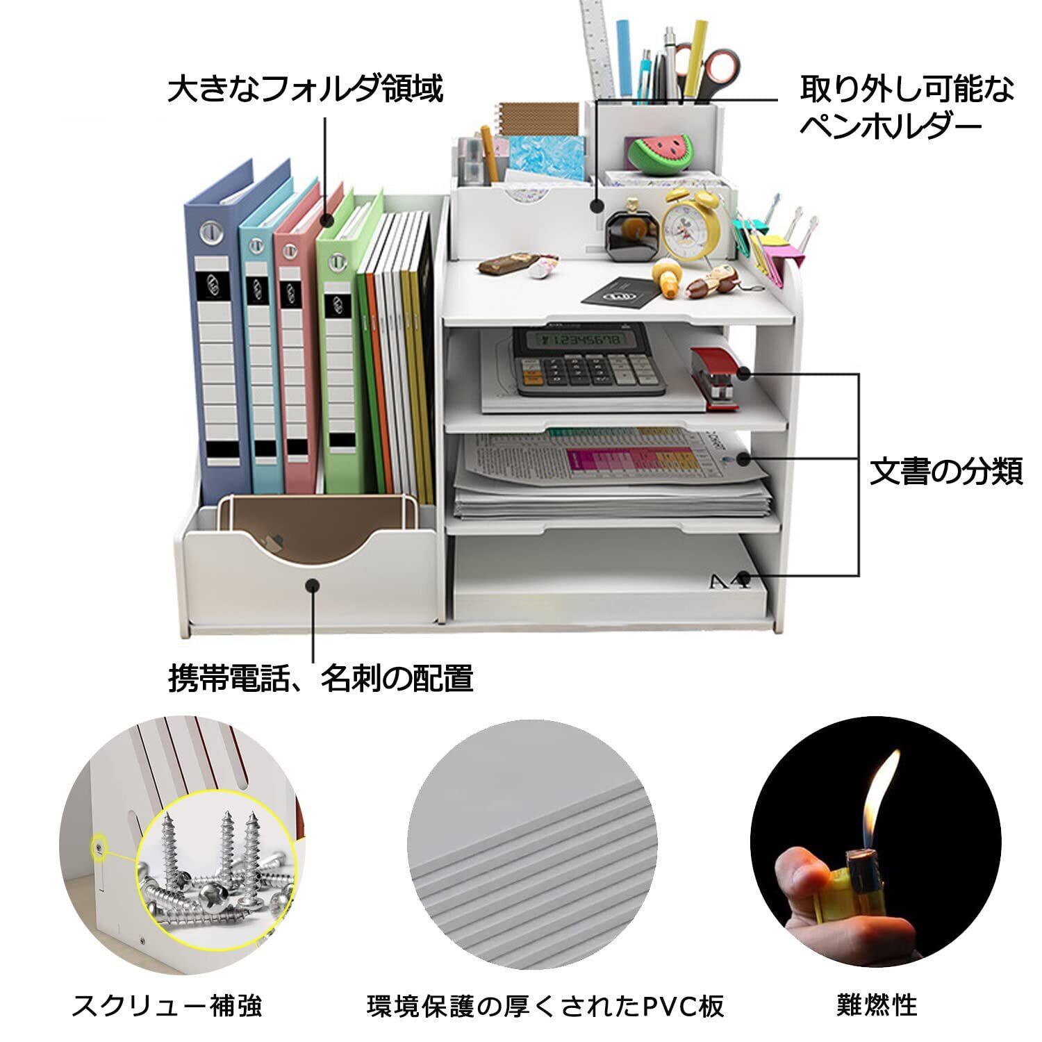高品質素材: サイズ:40 * 31 * 25 cm、卓上収納ラックは高品質のPVC素材でできており、お手入れが簡単、防水、耐火、無カビ、ひび割れ、非膨張などのメリットがあります!デスク上置き棚の表面は滑らかで美しく、アーク加工は滑らかで、本や手を傷つけず、ネジで固定でき、安定性と長寿命があります