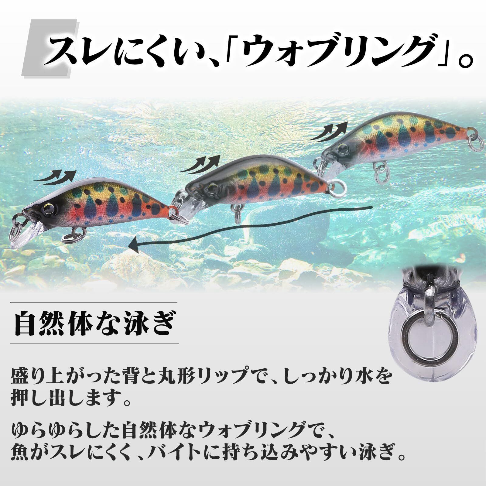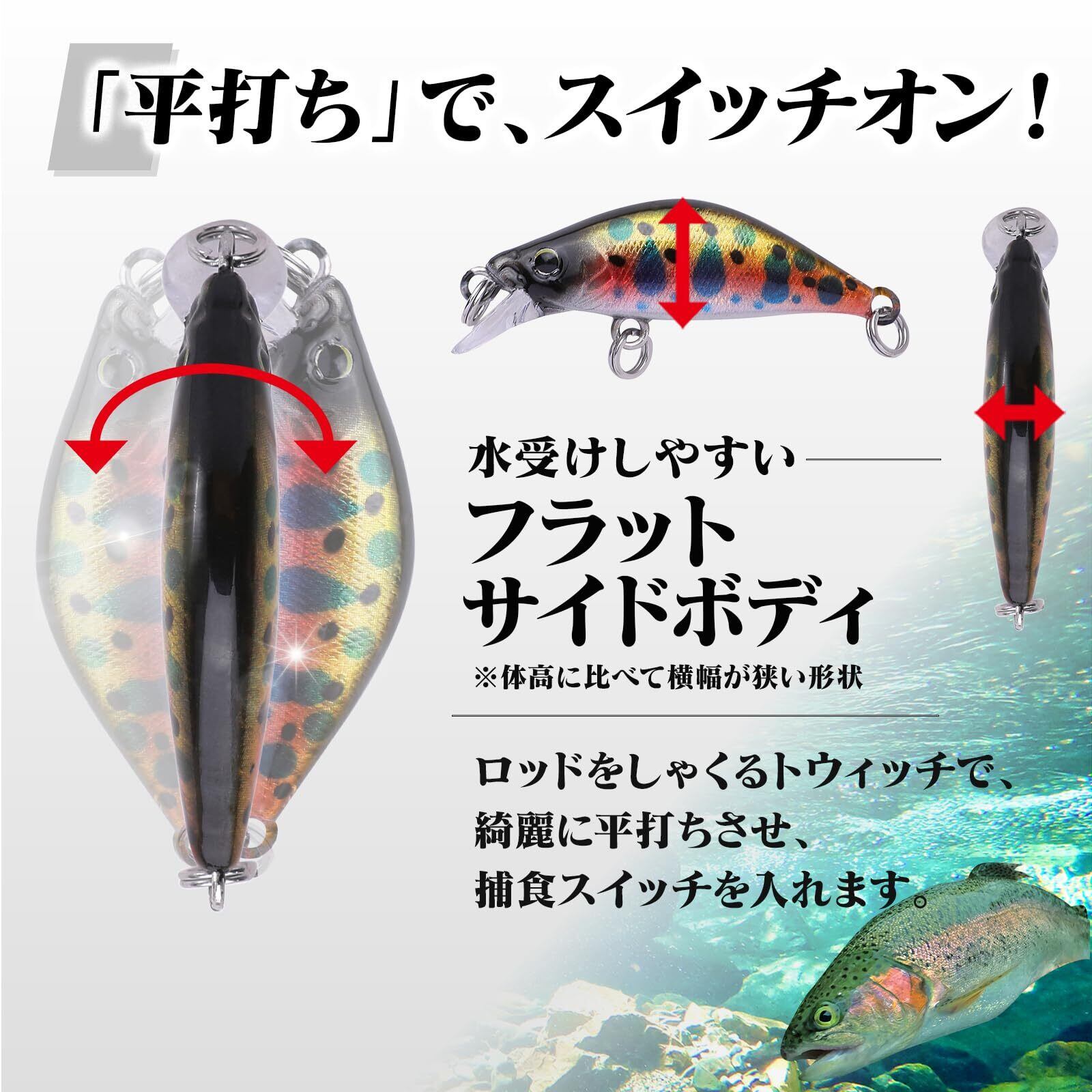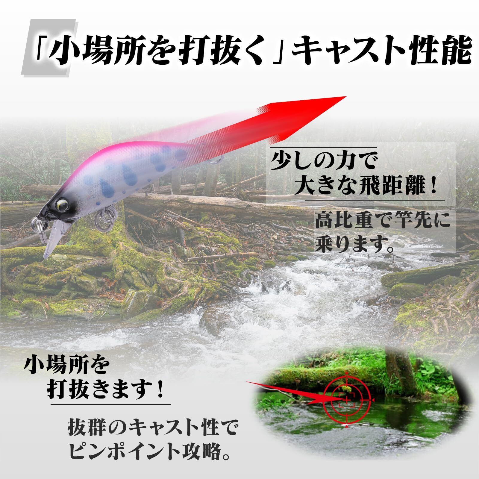【沢や源流でも】抜群のキャスト性能 短距離でもアピールする平打ち 水深が浅くとも活躍できるスローめなフォール 沢や源流でのシチュエーションでも活躍できる小型ミノー。