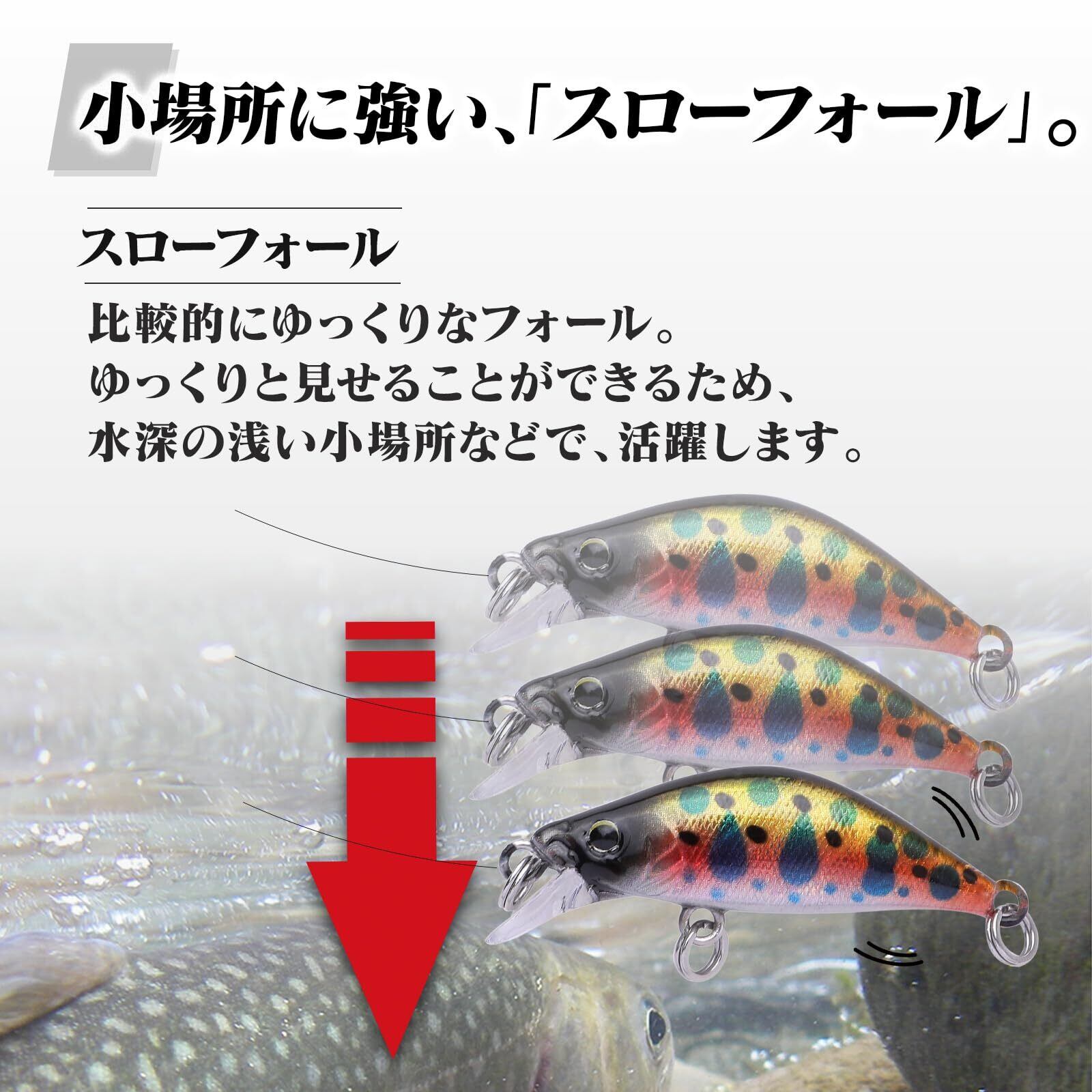 【スローフォール】比較的にゆっくりなフォール速度。/ゆっくり巻いて攻めたり、瀬に潜むターゲットにアピール可能です。