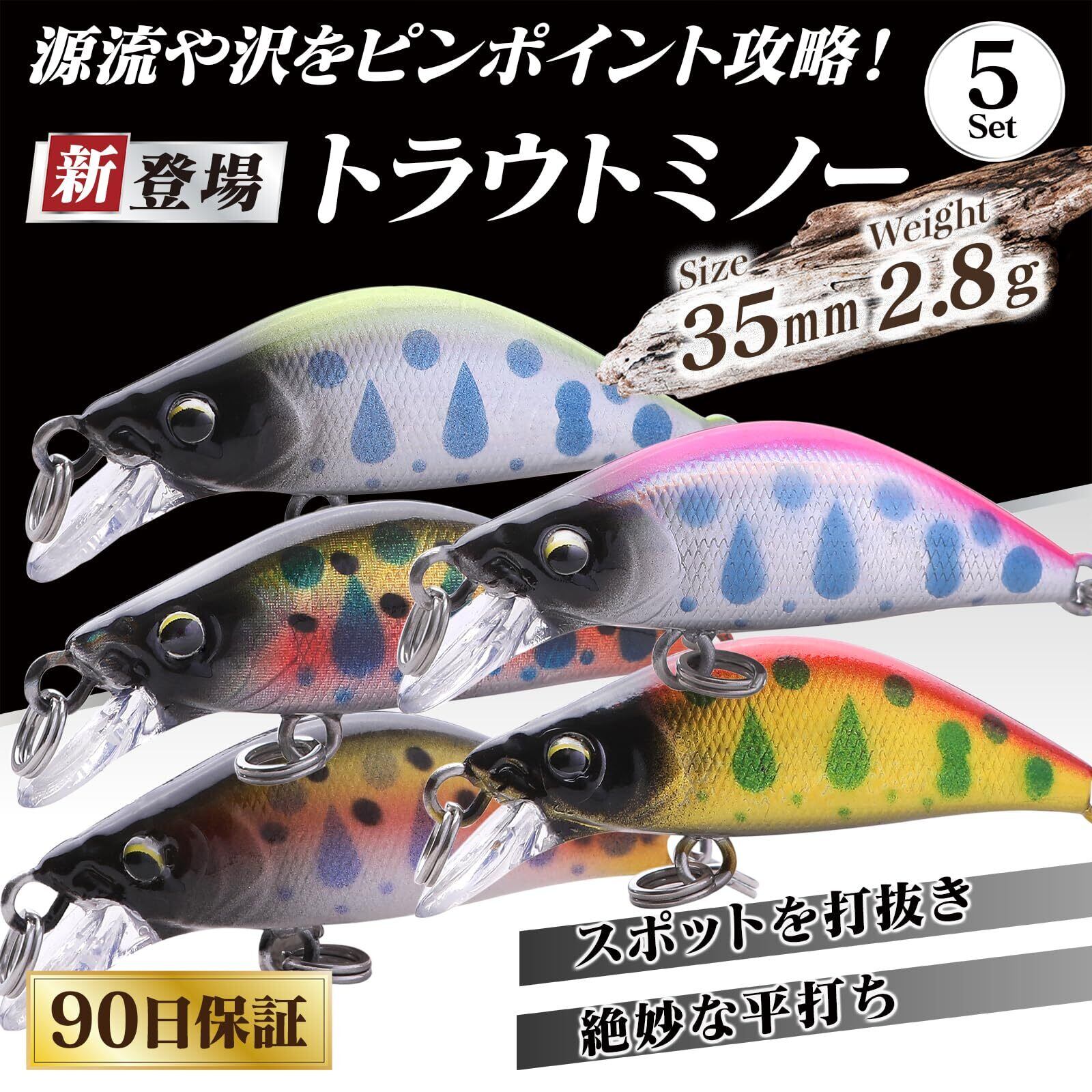 ≪スペック≫ サイズ:35mm 2.8g タイプ:シンキング 形 状:フラットサイド 重 心:テール寄り固定低重心 フック:未付属 スイム:ウォブリング 平打ち スローフォール フィールド:源流 沢 セット数:5色5個入り