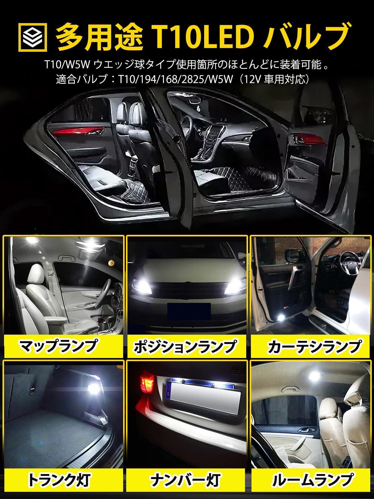 【多用途 LEDバルブ】T10純正球(T10)とほぼ同じサイズなので、純正交換用に取扱可能!ルームランプ、ナンバー灯、メーターランプ、ライセンスランプ、コーナリングランプ 、クリアランスランプ、ポジションランプ、ドアライトウエッジ電球などの交換ができ。 T10ライトは、その多機能性と広範な互換性により、車のさまざまな箇所に適用することができ、優れた照明効果を提供します。(具体的な適用場所はご愛車の型番をご確認ください。)