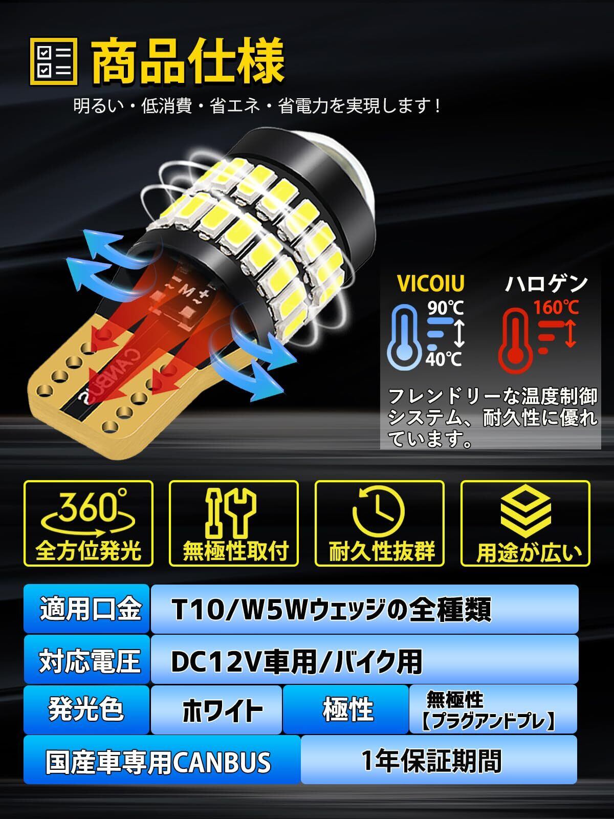 VICOIU T10 LED ホワイト 爆光 バルブ W5W T10 LEDポジションランプ ナンバー灯 ルームランプ キャンセラー内蔵 37個3014LED素子搭載 新型レンズ搭載 高耐久 無極性 6500K DC12V 車用 ナンバー灯 ルームランプ ポジション球 ライセンスランプ 2個入 (T10 LED ホワイト (2個入))