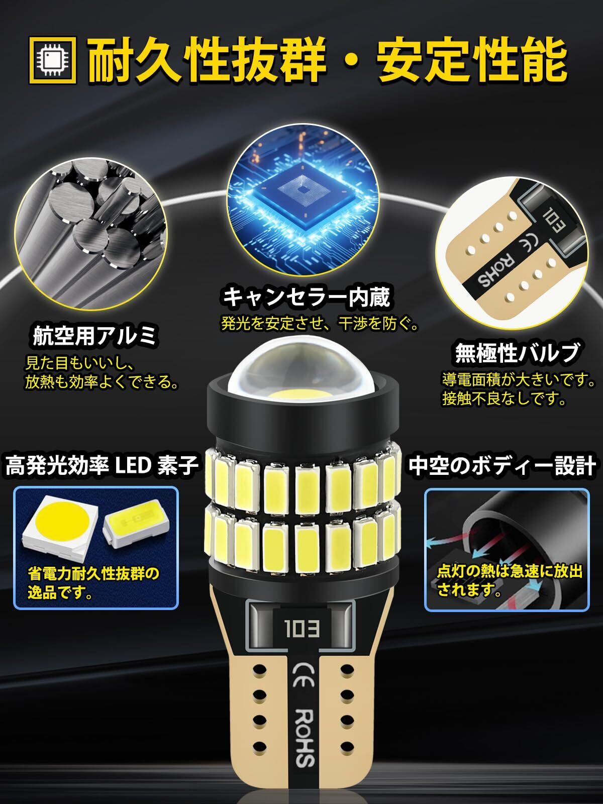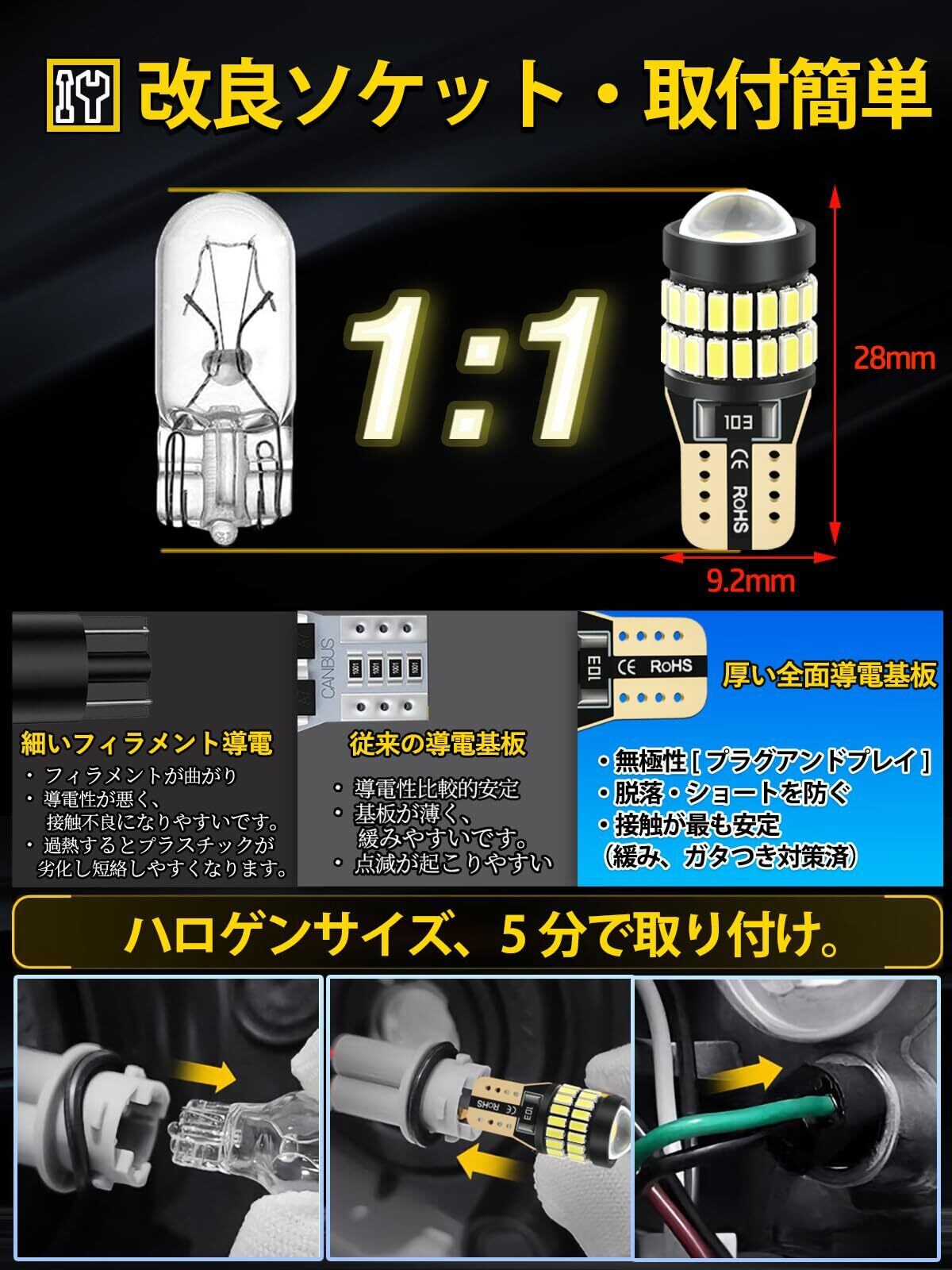 【強導電性バルブ・取付簡単】全面的に導電でき、市販品の導電鉄線より、LEDが焦げて不点灯や変形するの心配がなし。接触不良による点滅の心配もありません。無極性タイプなので差し込み方向を気にせずご使用可能です。コンセントの改良により、接続部が取付部で広く厚くなり、取付ミスによる短絡の心配がなくなりました。互換性が高いです!T10ウェッジの全類194、168、175、W5W 、147、152、158、 159、 161、184、 192、 2825を直接交替できる。