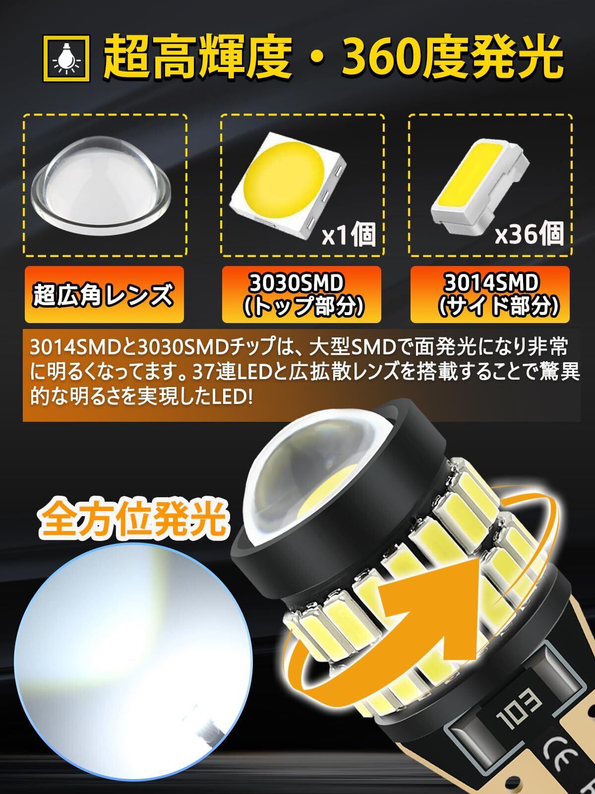 【新型レンズ搭載&360度発光】周辺に3014ledチップを36連搭載、先端に高効率の3030ledチップを1個搭載しています。さらに先端に光が広く拡散するようにドーム型レンズを装着しています。360°全方位の均一な照射が可能です。他の製品と比較しても、明るさが際立っています。純正ハロゲンに比べて消費電力を抑えられます。圧倒的な照射効率を実現させています。