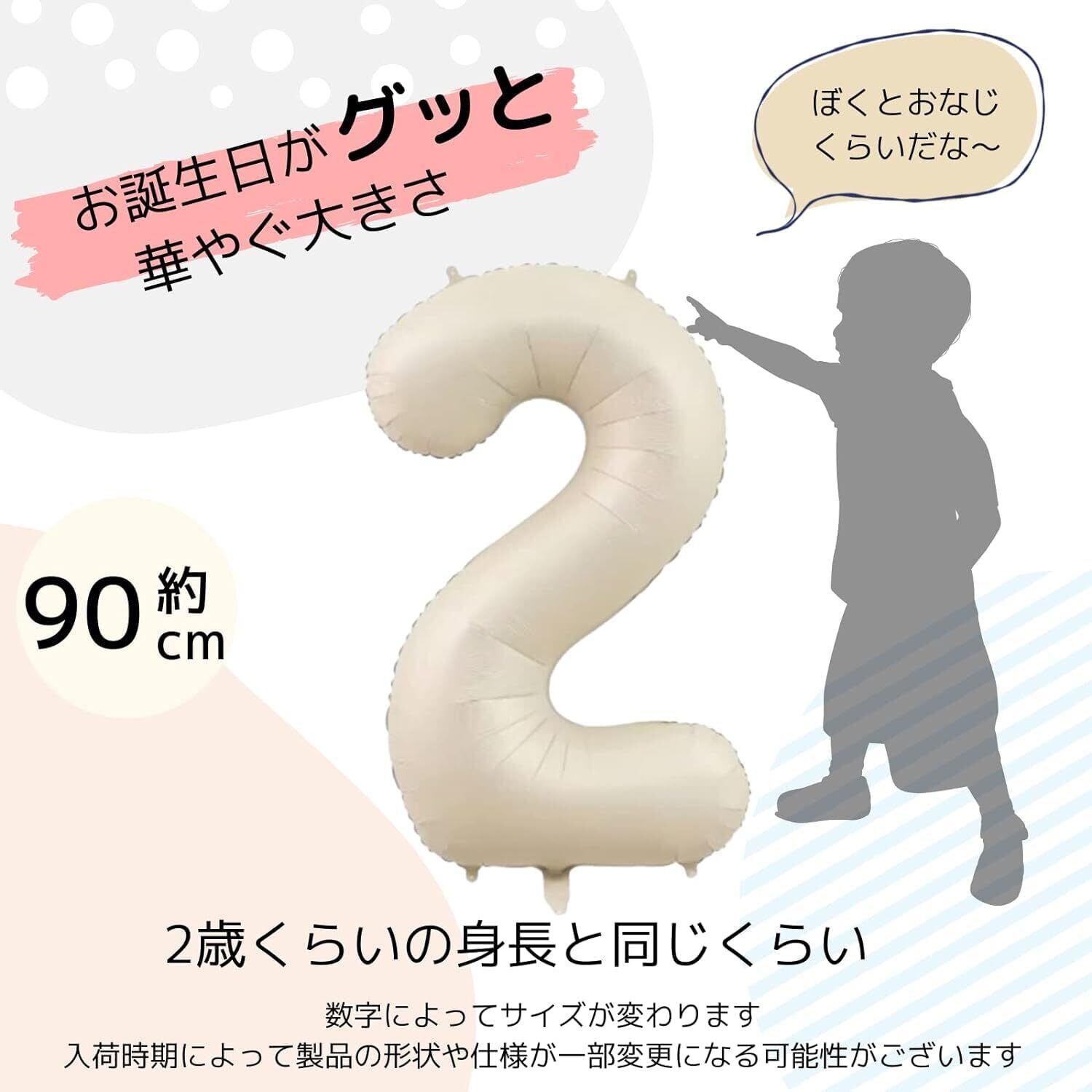 【セット内容、サイズ】数字バルーン×1(高さ約90cm)、HAPPY BIRTHDAY白風船×1(大きさ約25cm)、TO YOU白風船×1(大きさ約25cm)、クリアドットバルーン×2(大きさ約25cm)、グレーバルーン×2(大きさ約25cm)、グレージュバルーン×2(大きさ約25cm)ペタンコの状態でお届けです。ゴム風船には予備が付いているので万一の時にも安心です。膨らませ過ぎや静電気、温風などにはご注意ください。中の空気が膨張して破裂する可能性がございます。