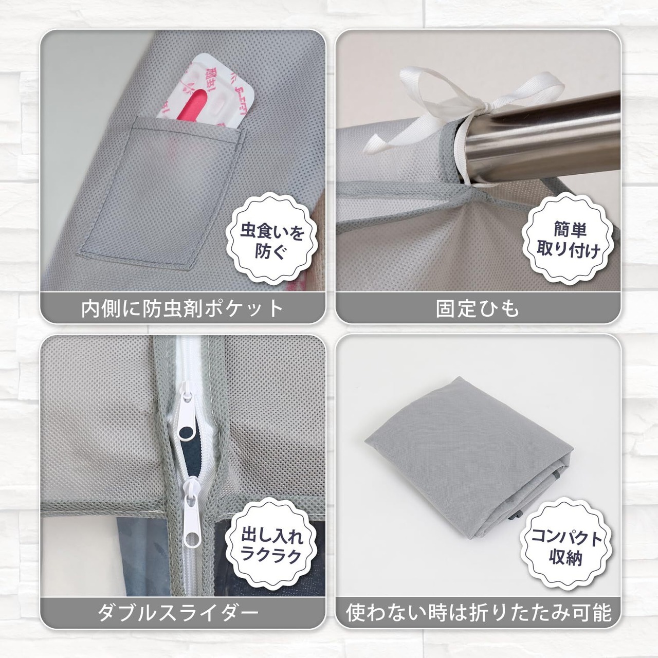 ● 防虫剤ポケットで安心の保管! ● 衣類の保管時に気になる防虫の心配も無用です。専用の防虫剤ポケットが付いているため、安心して衣類を収納できます。長期間の保管でも、安心してお使いいただけます。