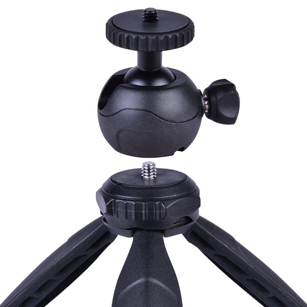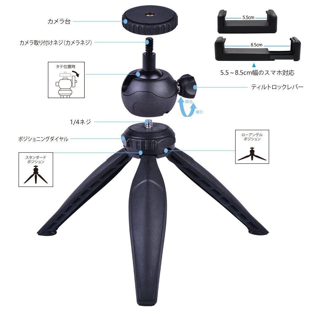 ボール部分と下の足部分は分離できます、ボールヘッドは取り外せる、ボトムグリップとしても便利なテーブル三脚。 360度回転可能の自由雲台装備、可動部がボール状でネジを緩めることにより自由にカメラの位置を固定できます、センター位置を変えずにタテ.ヨコ撮影可能。