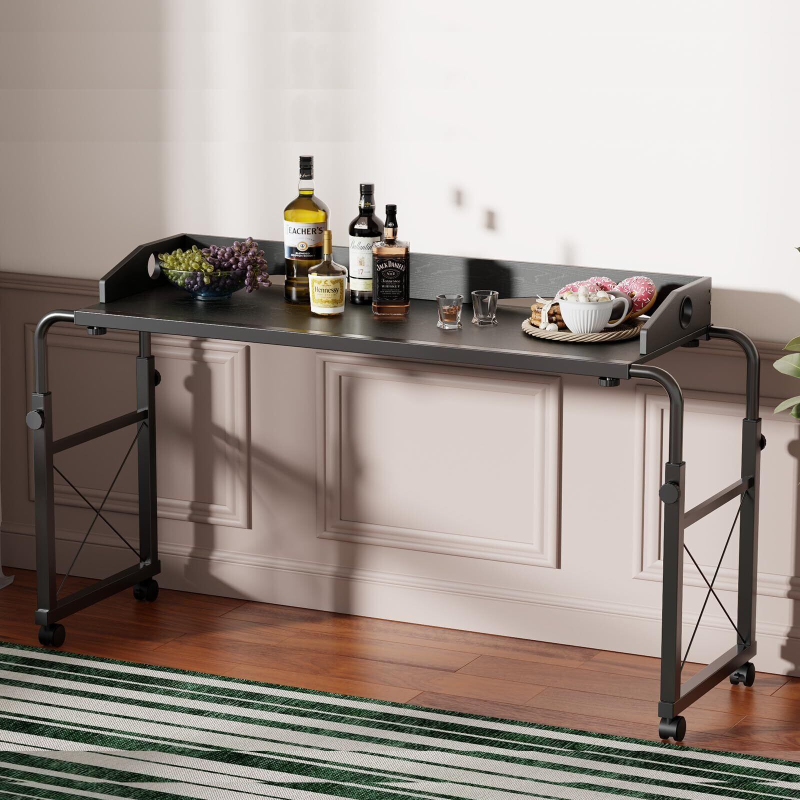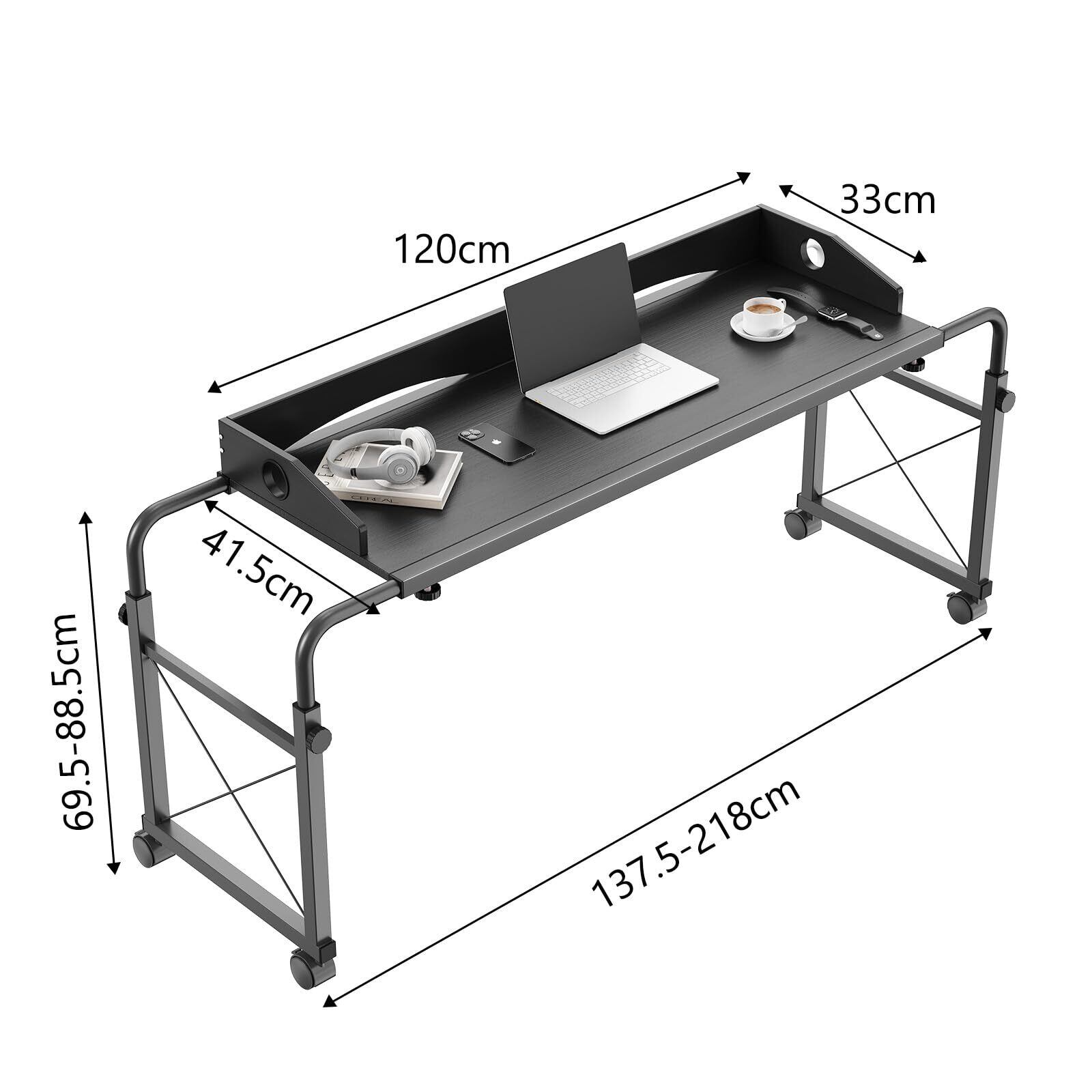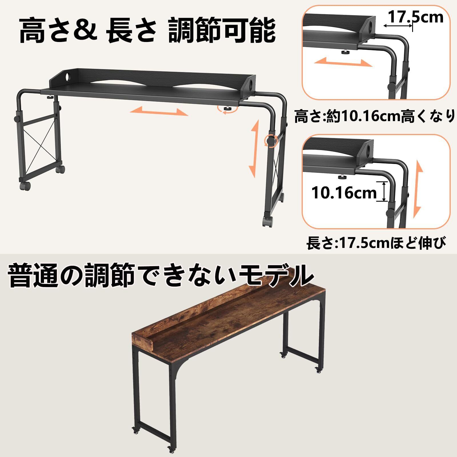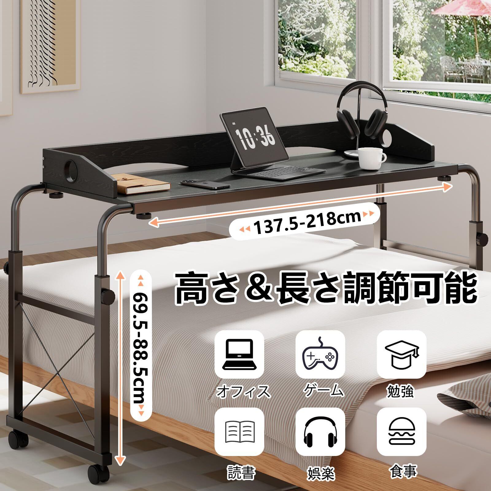 BESSTER オーバーベッドテーブル キャスター付き 木目調 高さ調整69.5-88.5cm 長さ137.5-218cm伸縮可能 おしゃれ 介護テーブル 昇降テーブル カフェテーブル ソファサイド コード用の穴 自宅/病院用/プレゼン/消毒液台/ベッド用デスク (ブラック)