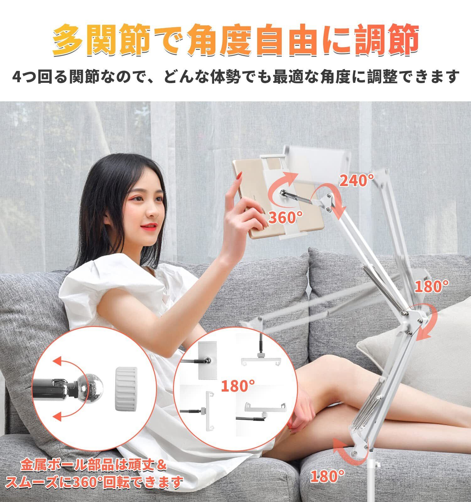 【4つ回る関節・360度回転・両手を解放】- 4つの関節でタブレットを360°角度と向きを自由に調節できて、思った位置に設置できます。タブレット用アームスタンドは床に置けばあなたの両手を解放します。ベッドやソファーで横になってタブレットを楽しんでいます。両手を解放し目と肩首の疲労を解消するためにも欠かせないスマホ スタンドです。