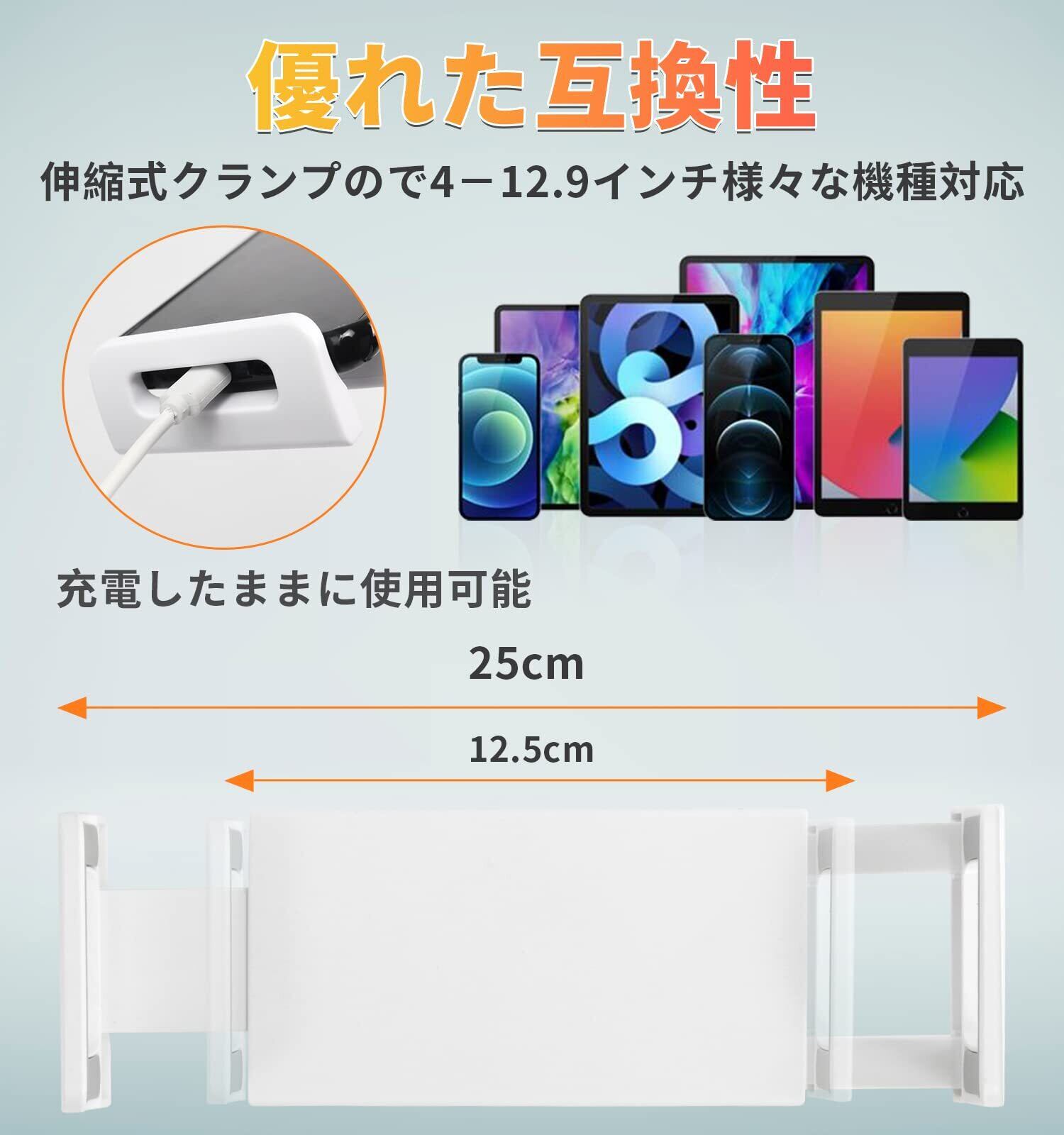 【4.5-12.9インチ機種対応・充電穴用意】伸縮式クリップにより、12-25cmまで拡張可能し、4-12.9インチの全てiPad/iPadPro/iPhone/android/surface/Kindle/Fire HD8/Switch などさまざまな機種に対応します。寝室での動画鑑賞、YouTubeを見て、在宅勤務、オンライン授業など、どんな場所でもご好みのように使用可能です。それ以外クリップ両側は充電穴を用意されて充電したままに利用可能します。