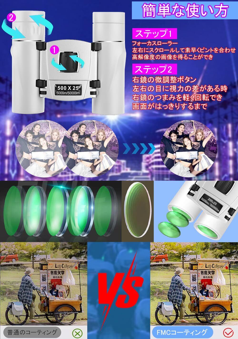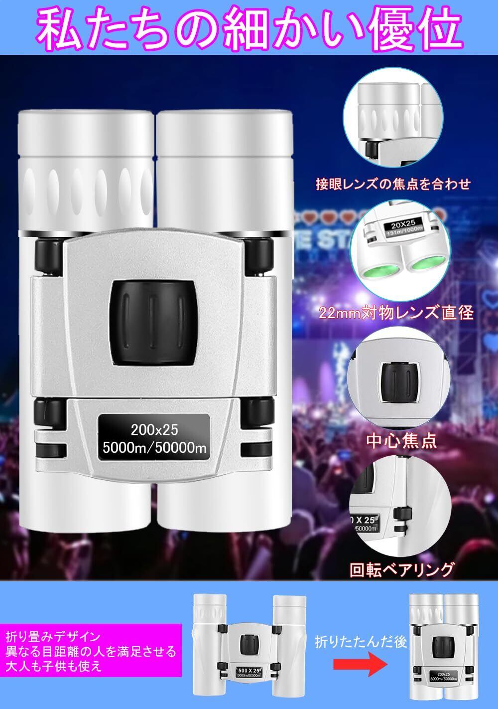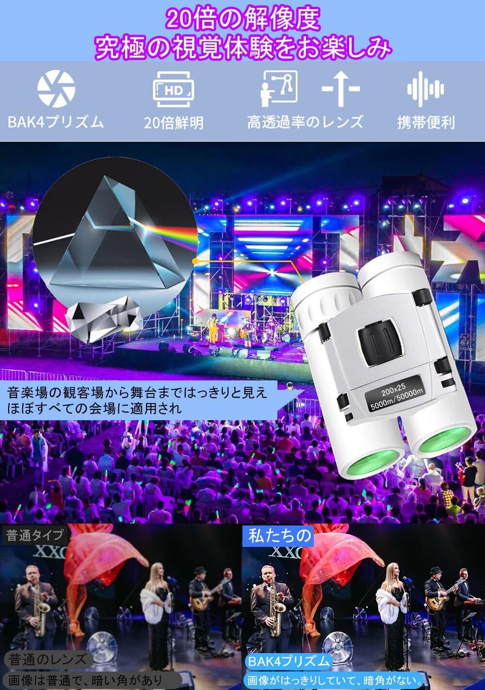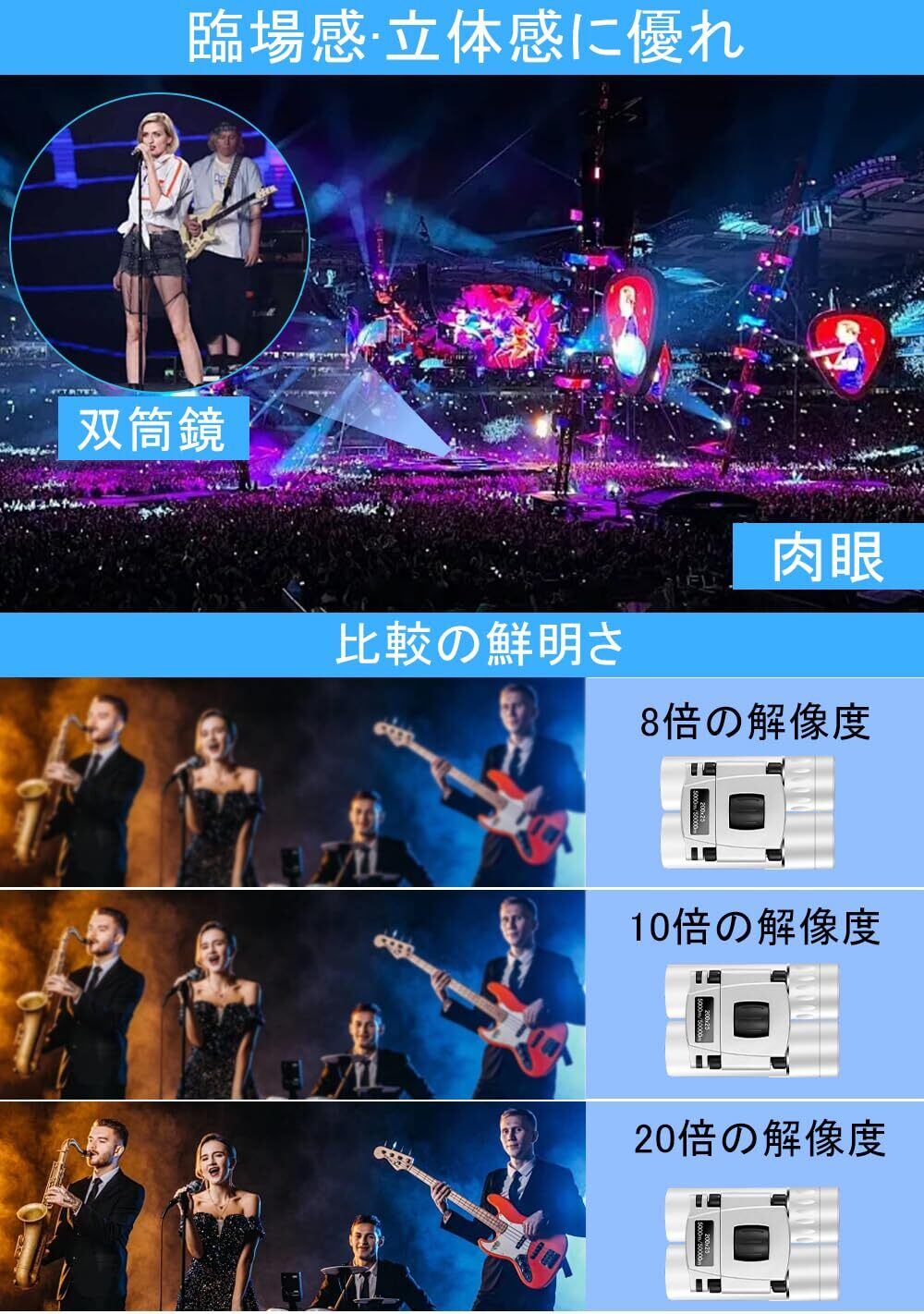 【どの席からでもアーティストを満足に見られる】コンサートでは、大切なクイズをできるだけ近くで見たいもの。そんな願いを双眼鏡が叶えます!倍率20倍の手持ち双眼鏡なら、スタジアムやドームなど広い会場でも手ブレを気にせず観戦できます。簡単に言えば、肉眼と同じ大きさで10メートル先から300メートル先まで見ることができます。