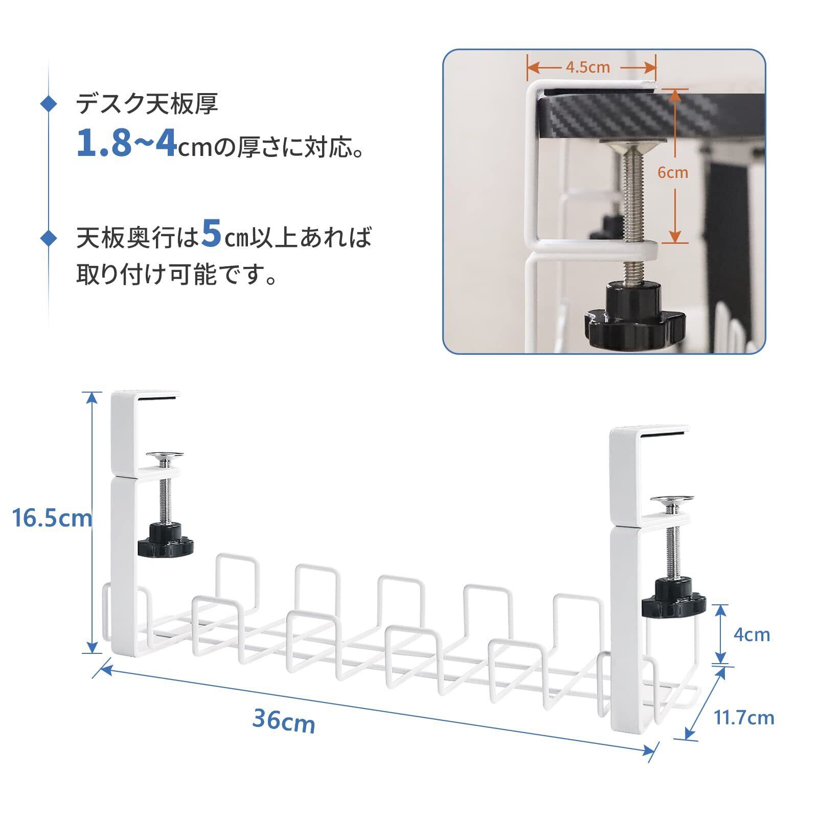 【クランプ式、組立不要】 ネジ不要。組立不要。完成品でお届けます。天板奥行は5cm以上あれば取り付け可能です。デスク天板は厚さ1.8~4cmに対応しています。