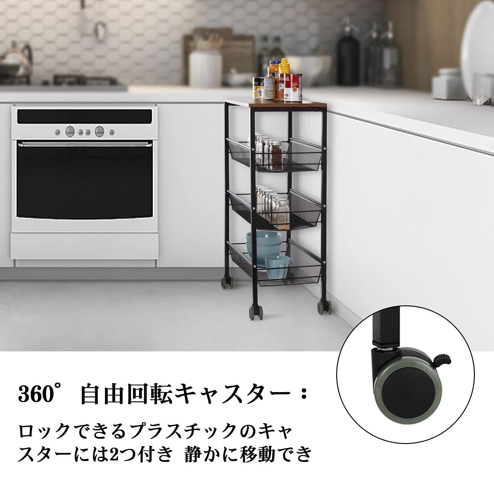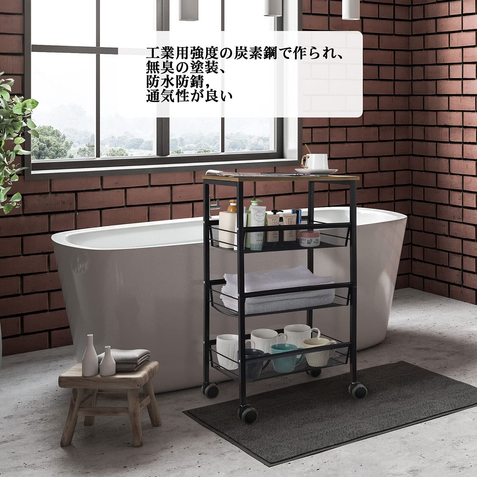 キッチンワゴン 4段 キッチンラックワゴン 木天板付き キッチン収納カート 調味料 収納 ローリングカート キャスター付き 移動式 スチール製 多目的 台所 浴室 寝室 リビング 幅44×奥行29×高さ76.5cm 組み立て簡単 (ブラック)