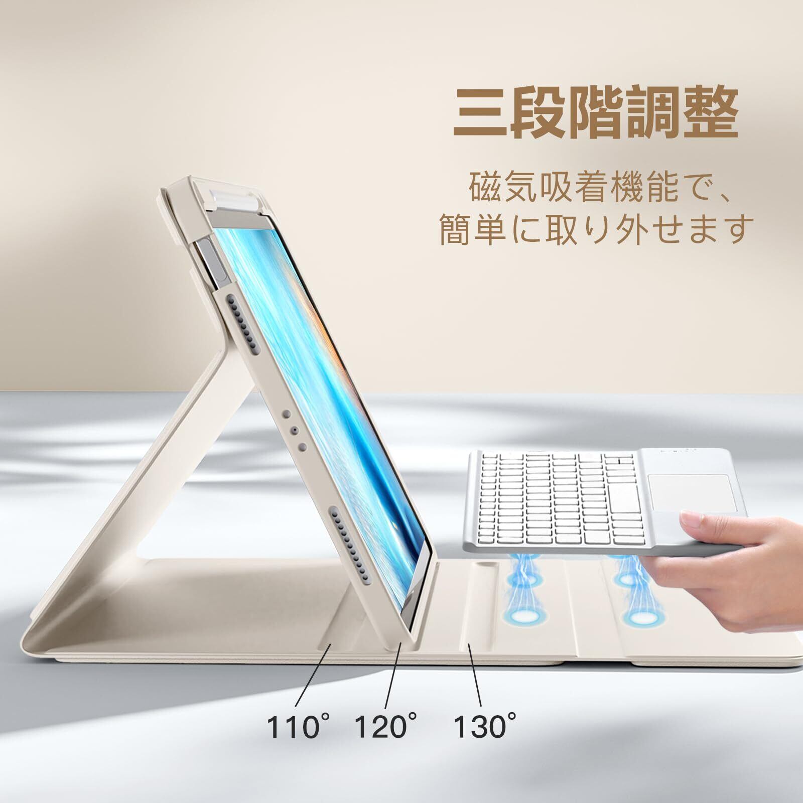 【脱着式キーボード&便利なApple Pencil収納】 キーボードは脱着式で、強力なマグネット内蔵により安定して装着可能。Pencilホルダー付きで、ペンやアダプタをしっかり収納。持ち運びも便利!作業や動画視聴に合わせて自由に角度調整可能。様々なシーンで活躍!