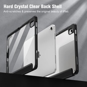 【材料・透明バックカバー】ケースの表面はPUレザー素材を利用して、軽量、超薄を備えます。ポリカーボネート素材を採用している透明バックカバーは汚れや傷つけなどを防止するだけでなく、iPad本体の色と美しさも活かせます。透明バックカバーの枠は柔軟な TPUを採用して、取り付けも簡単にできます。フロントカバー内部材質はマイクロファイバーで、摩擦によって発生する傷を抑え、液晶画面を保護しきれいに保ちます。(ご注意:透明バックカバーには保護用のフィルムがついていますので、ご使用前に保護フィルムを剥がしてください。)