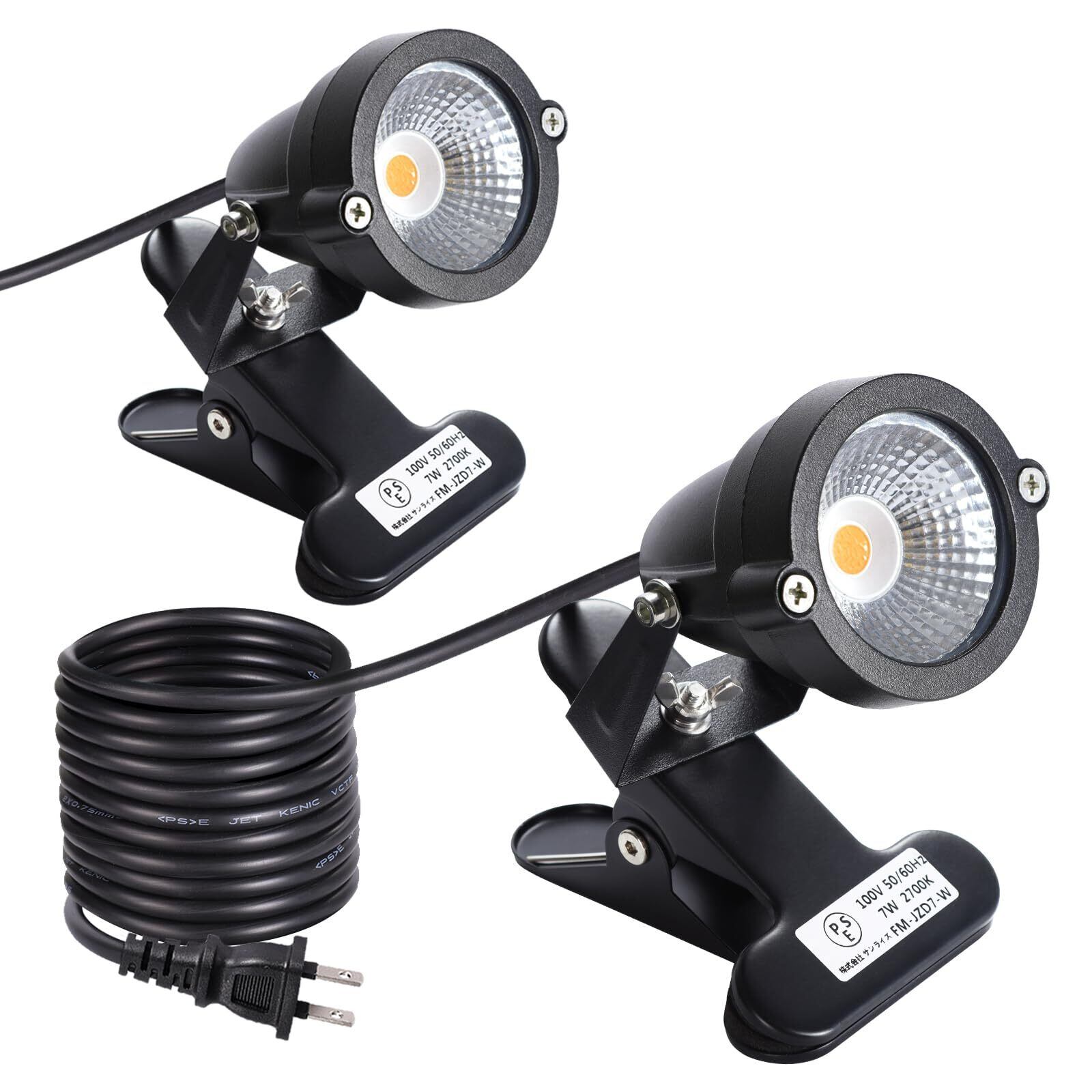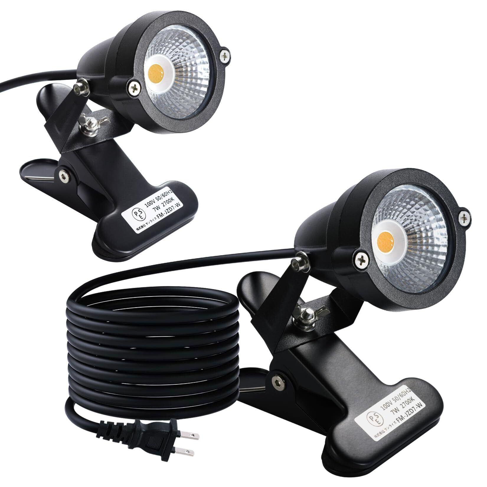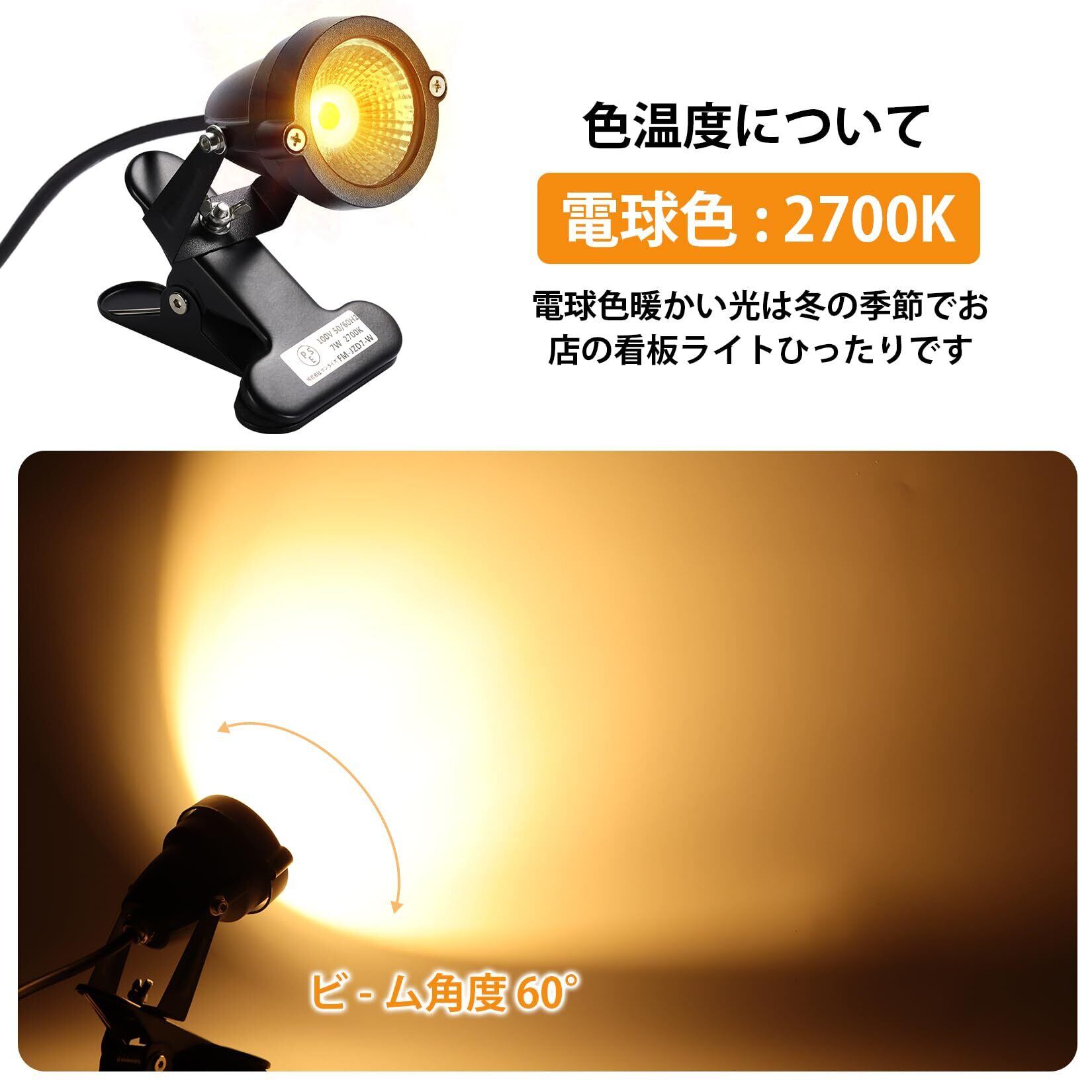 【最新モデル・PSE認証済】電圧:AC100V ( AC85/265V ) / 消費電力:7W / 色温度:2700K( 電球色 ) / 照射角度:60°/ クリップくわえ幅 :約10~80mm / 防水規格:IP65 / 電源コード:約3m ※付属品:六角レンチ2本