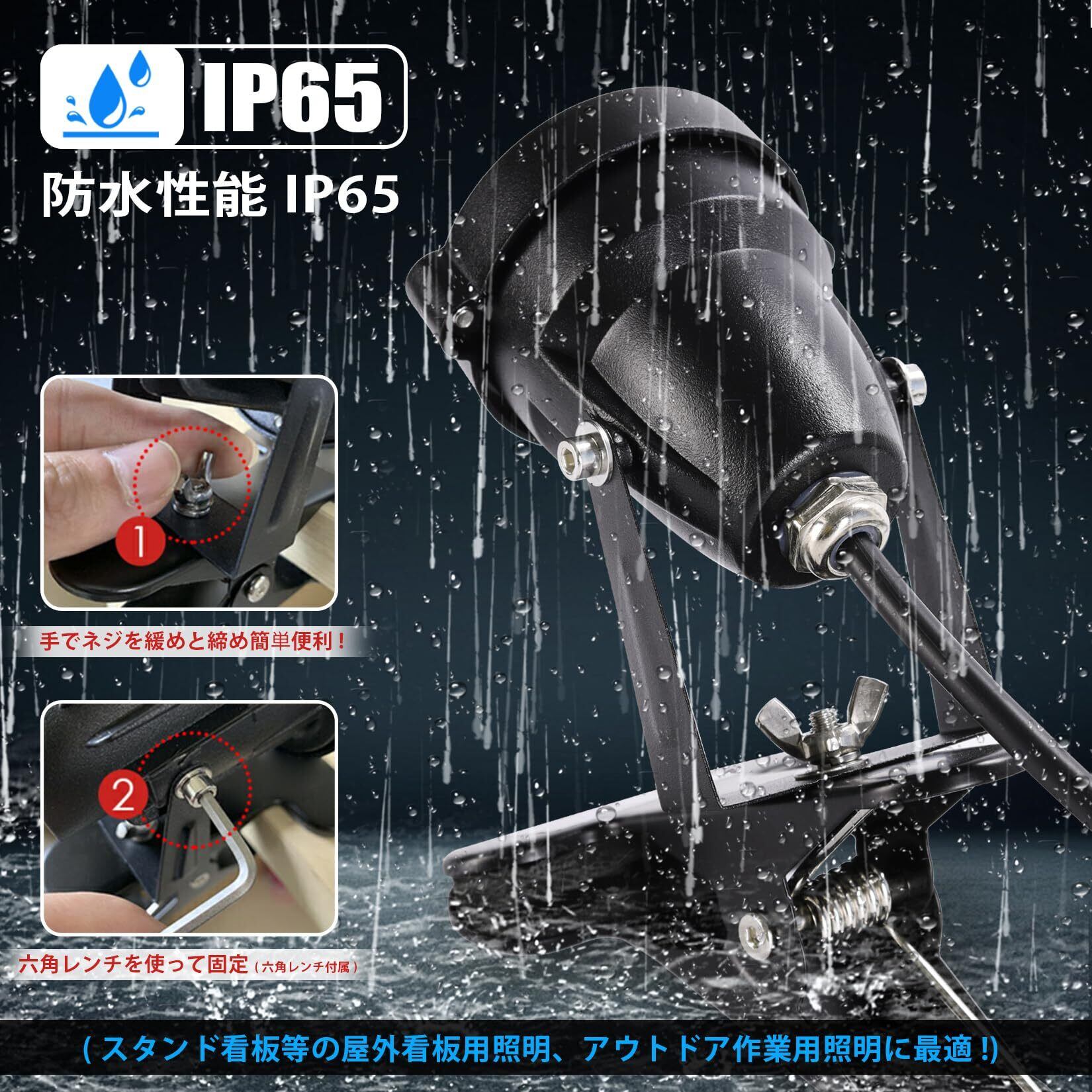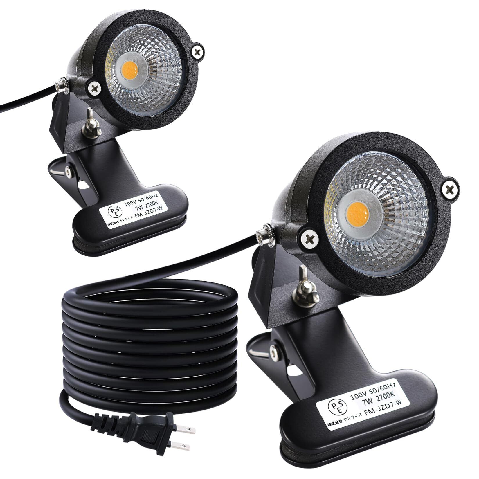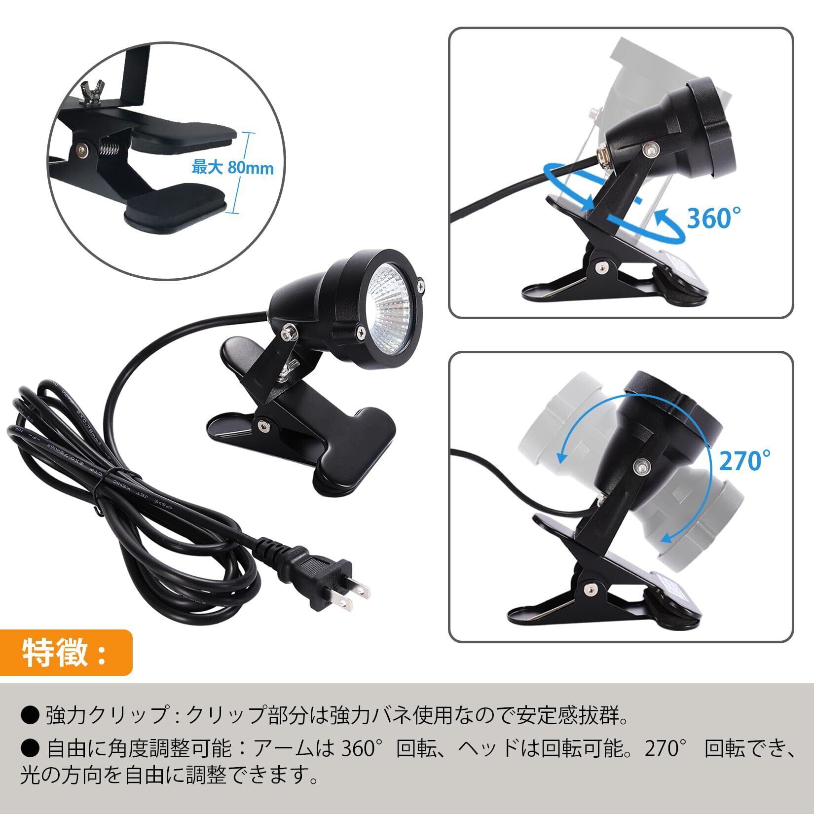 【最新モデル・PSE認証済】電圧:AC100V ( AC85/265V ) / 消費電力:7W / 色温度:2700K( 電球色 ) / 照射角度:60°/ クリップくわえ幅 :約10~80mm / 防水規格:IP65 / 電源コード:約3m ※付属品:六角レンチ2本