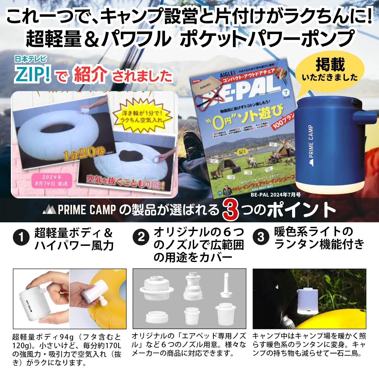 ● 快適なアウトドア体験をサポート! ● 「プライムキャンプ エアーポンプ」は、超軽量で強力な170L/分の空気入れ能力を備えた電動エアーポンプです。キャンプやビーチでのインフレーターマットや浮き輪の膨らませに最適なアイテムです。