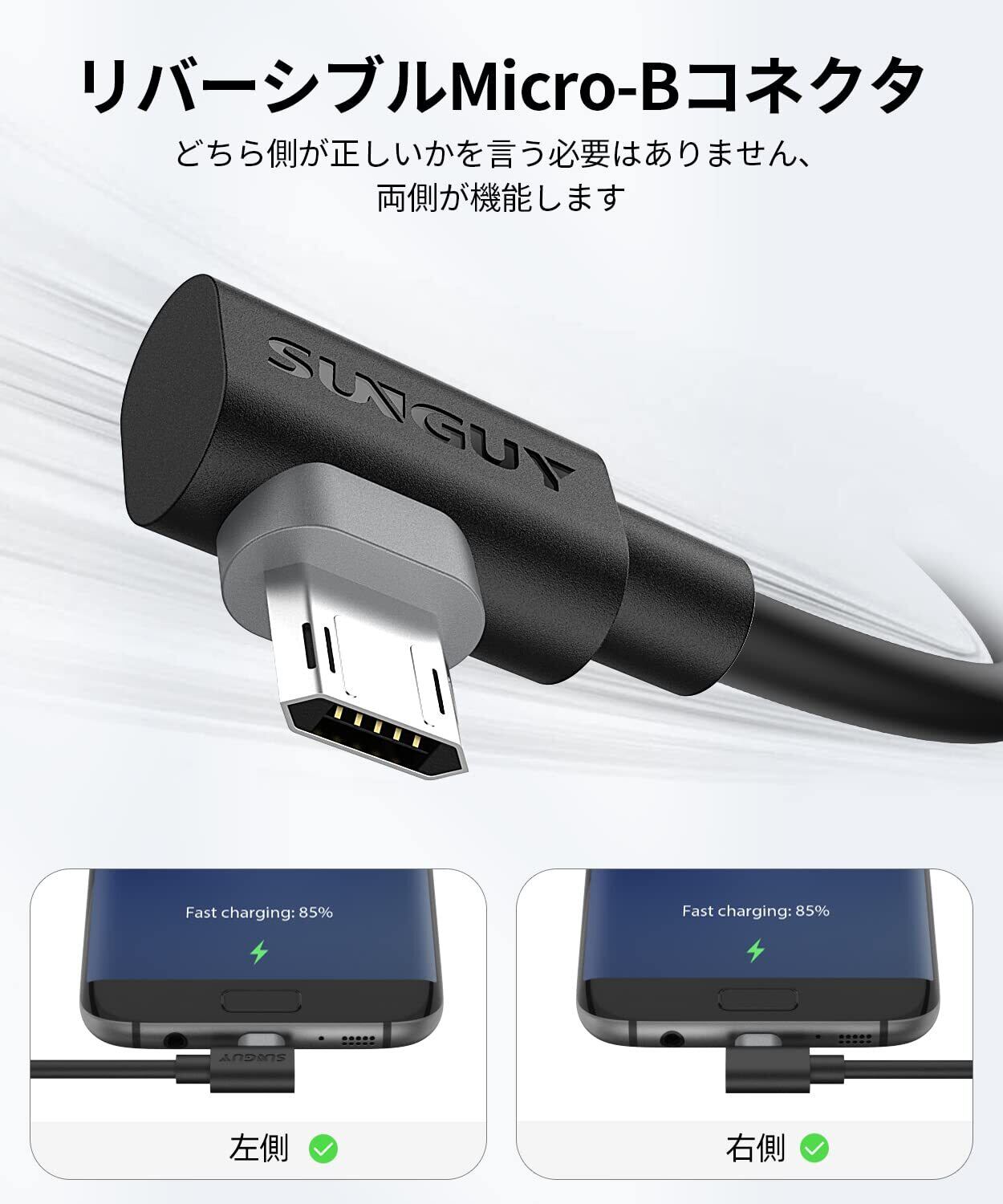 ● 快適な充電ライフをサポート! ● 「SUNGUY マイクロUSBケーブル l字 2M」は、急速充電とデータ転送を両立させた高性能なMicro USBケーブルです。長めの2メートルサイズで、使いやすさも抜群です!