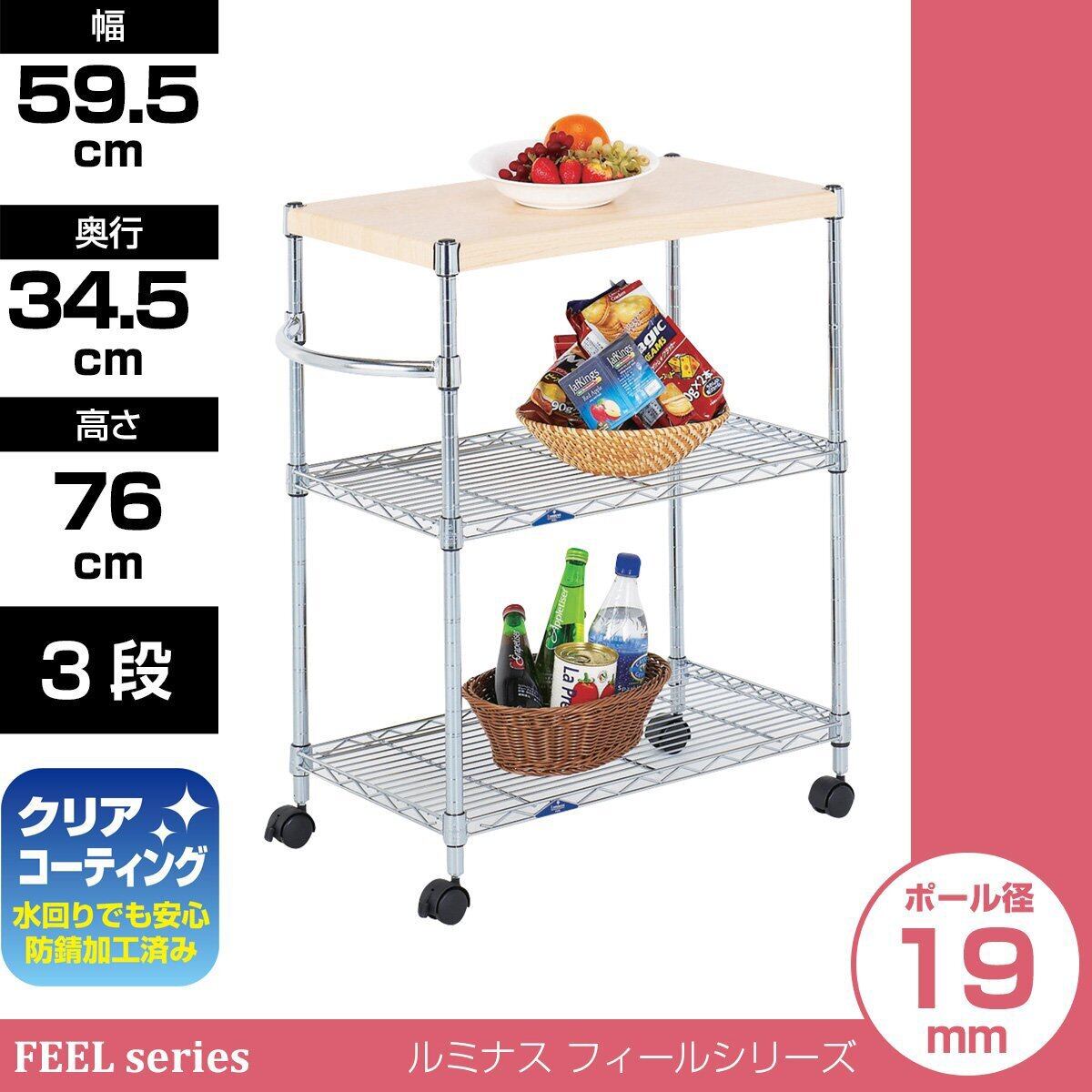 ドウシシャ ルミナス フィール キッチンラック ワゴン スチールラック 隙間収納 収納棚 幅35 3段 サビに強い 組立簡単 木棚付き キャスター付き 耐荷重80kg (棚板1枚) ポール径19mm 幅34.5×奥行59.5×高さ76cm MD6074-3MW