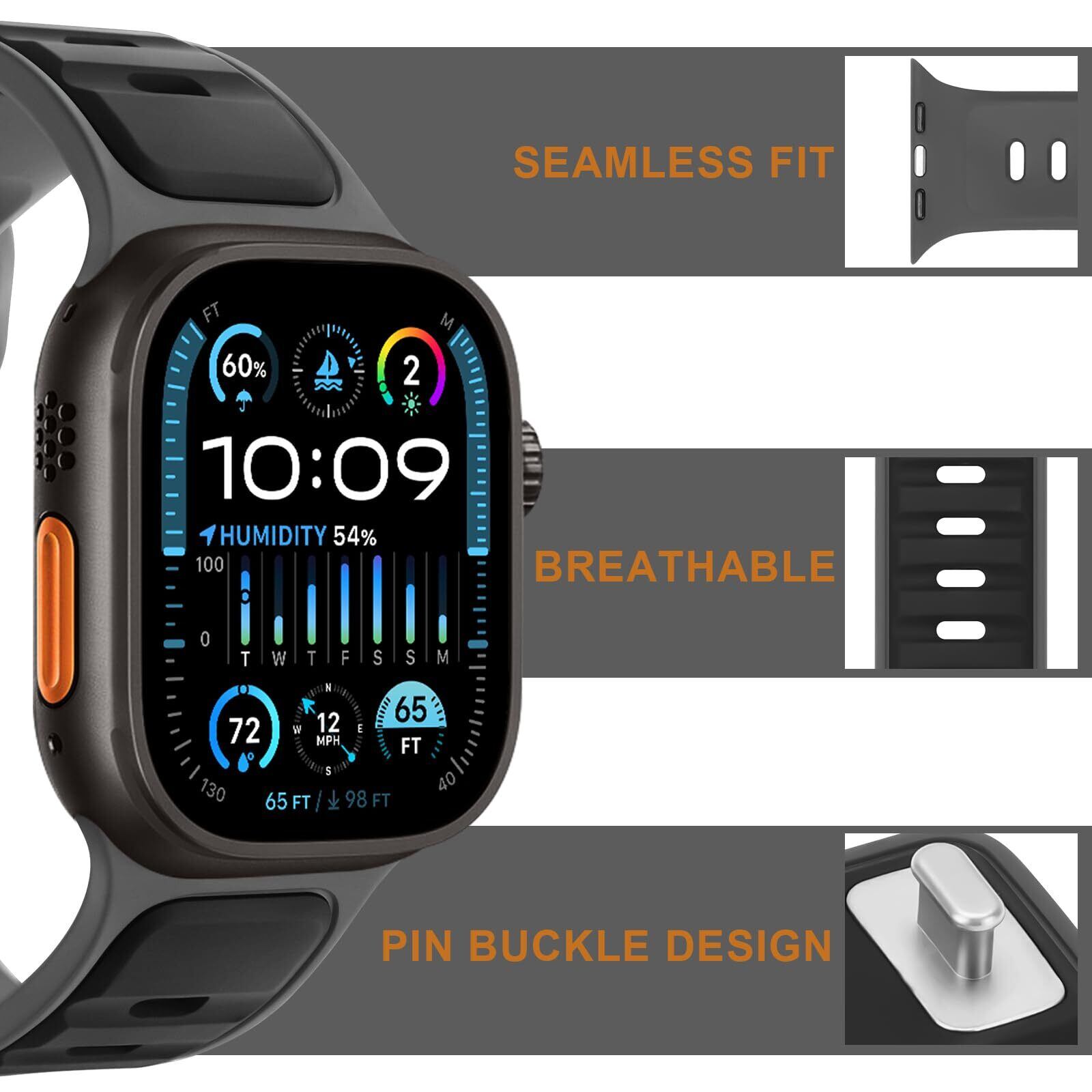 Anlinser バンド コンパチブル アップルウォッチ バンド Ultra 2/Ultra 49mm 46mm 45mm 44mm 42mm 41mm 40mm, 防水シリコンスポーツバンド コンパチブル Apple Watch バンド Ultra 2/Ultra シリーズ SE 10 9 8 7-1(49/46/45/44/42,ブラック/グレー)