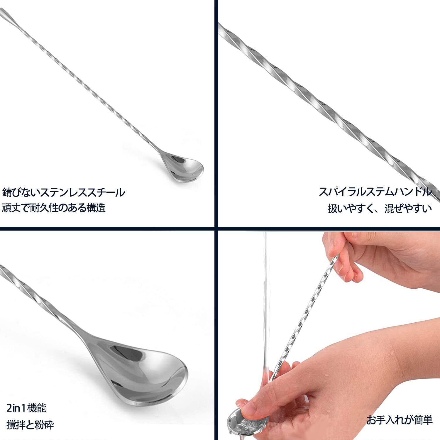 ● 優れたデザインで使いやすさ抜群! ● バースプーンは30cmの長さで、容器の奥までしっかりと混ぜられます。また、ジガーカップは大きさが異なる2種類(30mlと45ml)から選べるため、さまざまなドリンクに対応しています。
