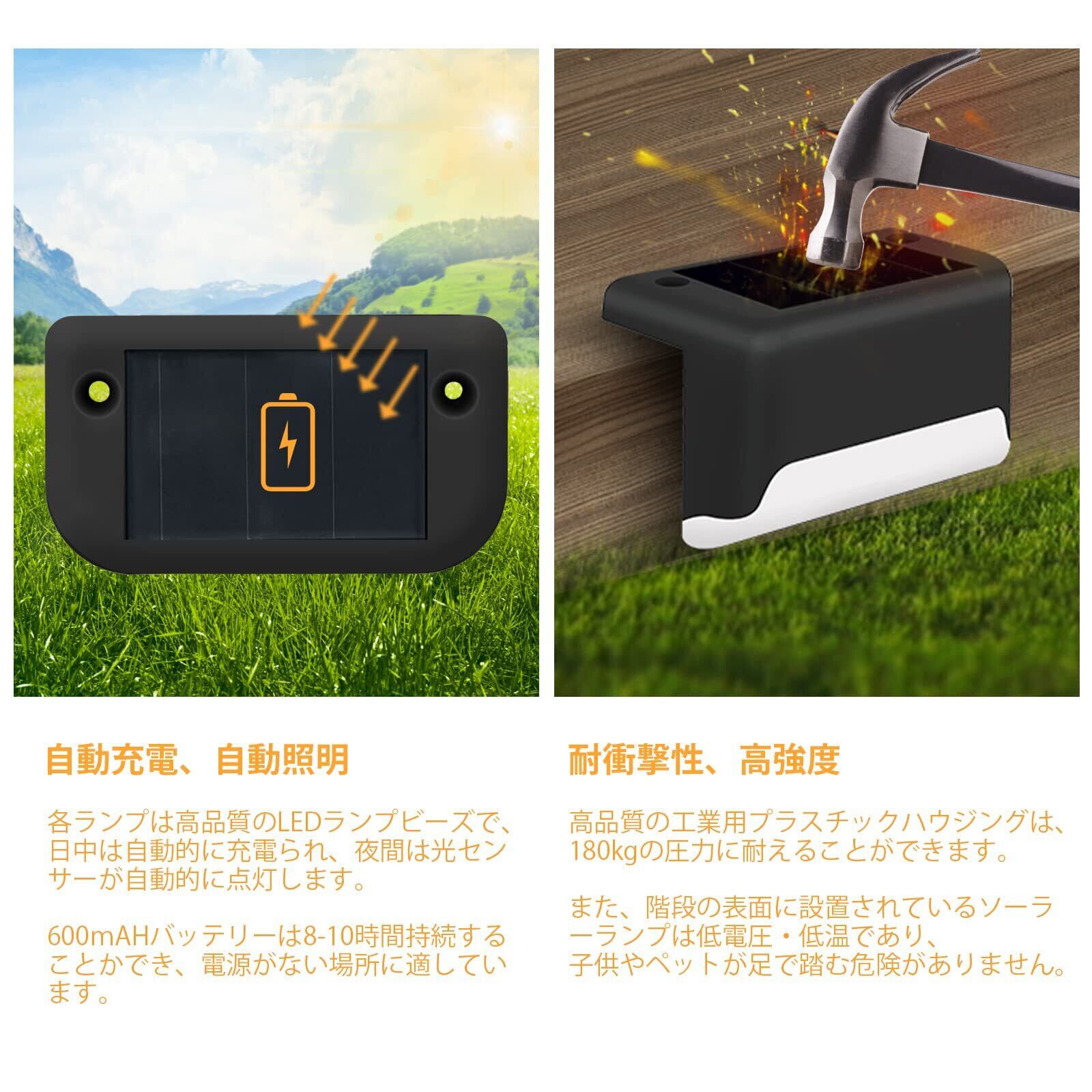 【優れた素材、IP65防水】当社の階段ソーラーライトは、業界で優れた放熱性能を備えた高品質のLED光源チップ、最大93%の太陽光変換率を備えた高品質のポリシリコンソーラーパネルと耐久性のあるABSハウジング、プラスチックプラグスイッチ、ライトセンサー装置で作られます。強風、大雪、砂利、自然災害に耐えることができ、丈夫で耐久性があります。 IPX65の防水性能を備えたソーラーライトは悪天候でも対応。破損の心配はありません。安心利用いただけるソーラーライトです。
