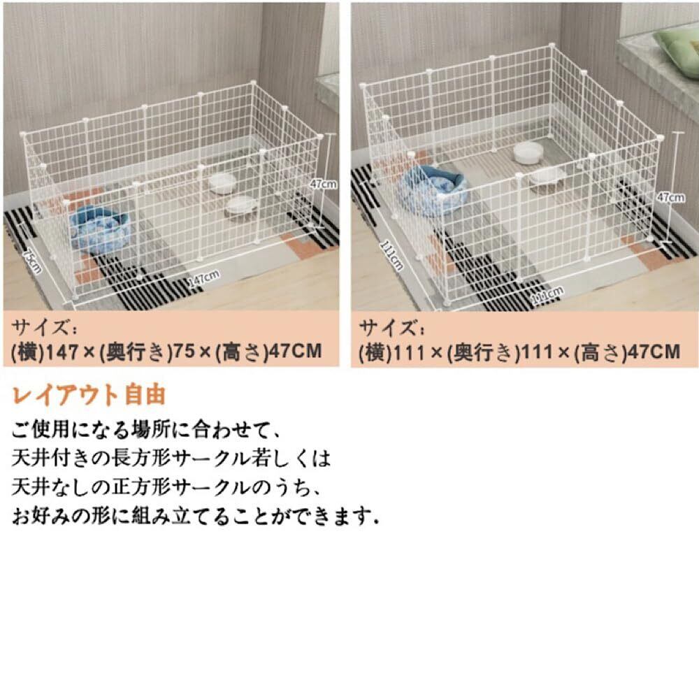 レイアウト自由 形を自由にレイアウトできるペットフェンスです。ご使用になる場所に合わせて、長方形、正方形、L字形のように、お好みの形に組み立てることができます。また、パネル縦横の向きを変えると、ペットフェンスのサイズも変わりますので、是非お試しください。