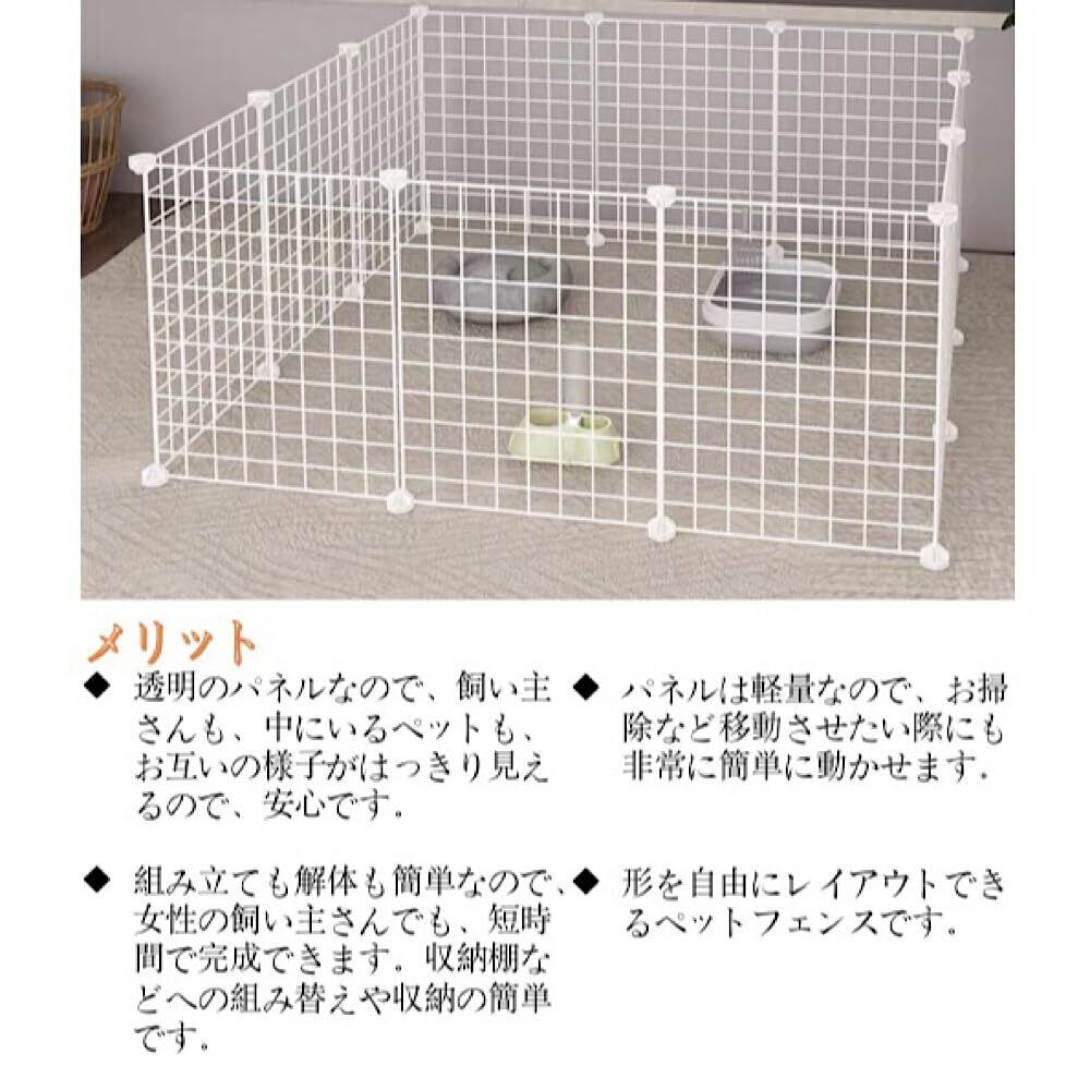 組み立て、お手入れ簡単 コネクタで軽量タイプのパネルをジョイントするだけなので、女性の飼い主さんでも、短時間で完成できます。メッシュパネルはコンパクト軽量タイプなので、使用しない際には、簡単に解体・収納できます。天井なしのペットフェンスなので、お掃除する際にも非常に便利です。パネルが汚れた際でも、表面を拭くだけなので、お手入れは簡単です。