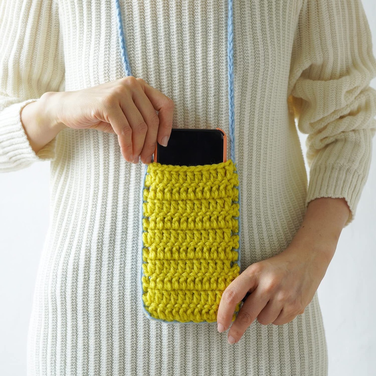 キット内容:毛糸…アクリロL(50g玉巻き) /水色(10)1玉、イエロー(13)1玉・レシピ…1枚(動画解説のQRコード付き)