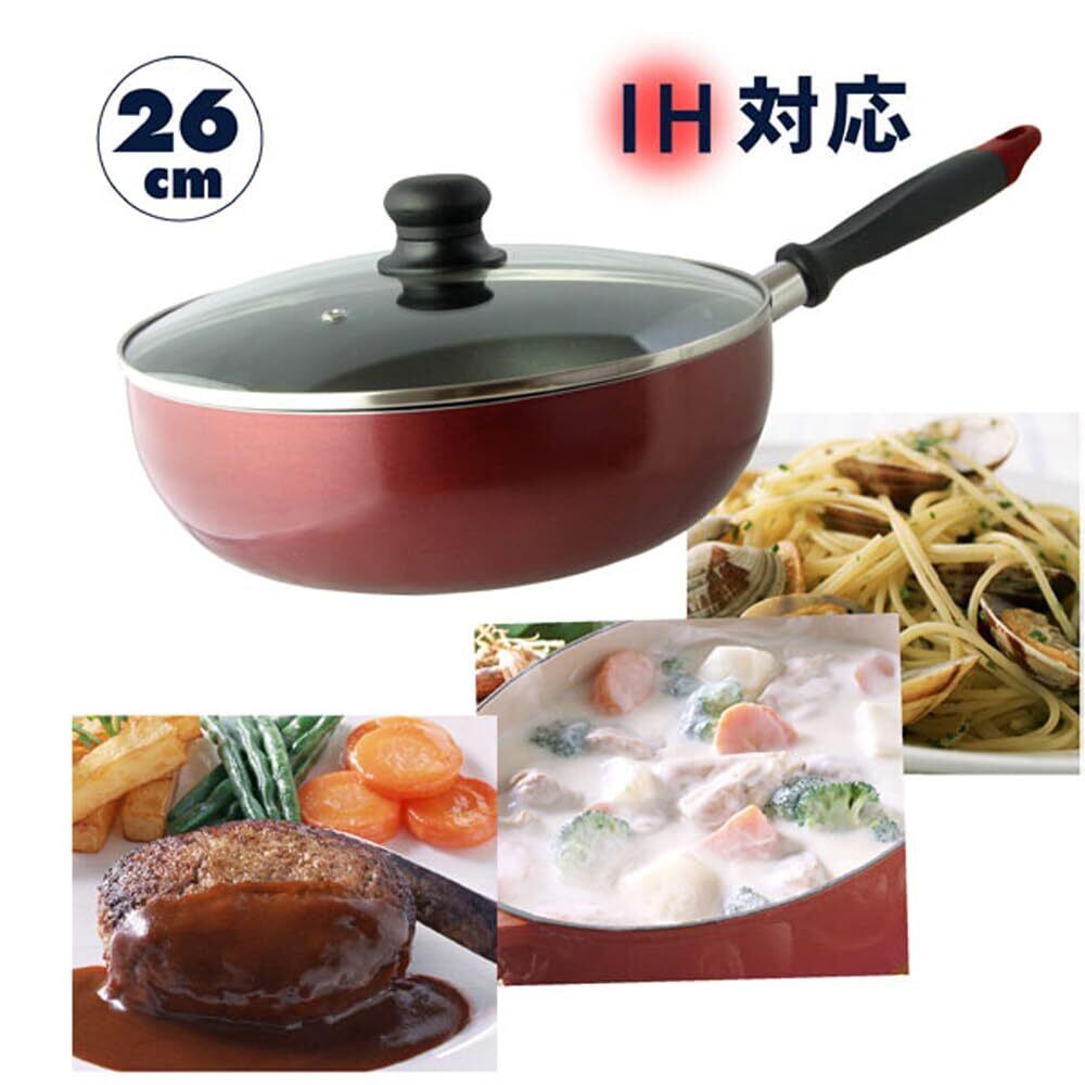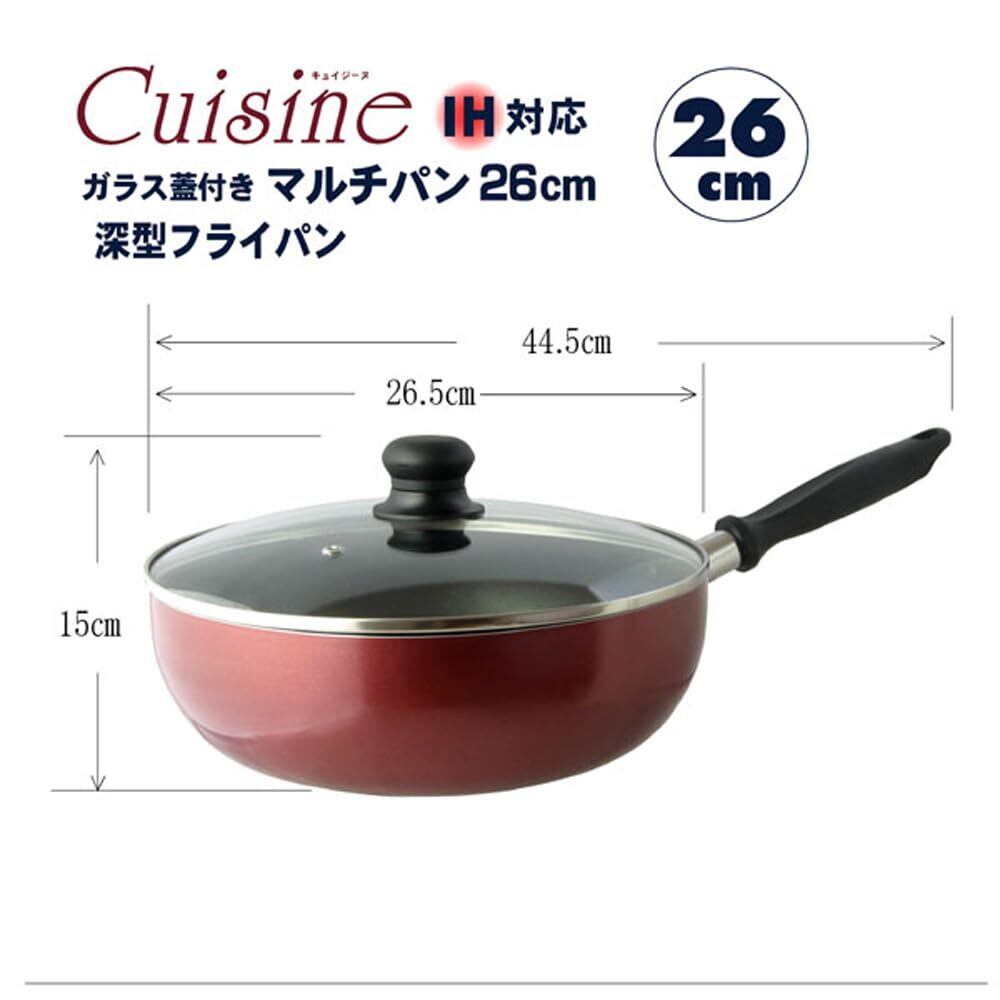リビング(Living) フライパン 深型 炒め鍋 マルチパン 26cm ガラス蓋 付属 IH対応 フッ素加工 焦げ付きにくい レッド CUISINE