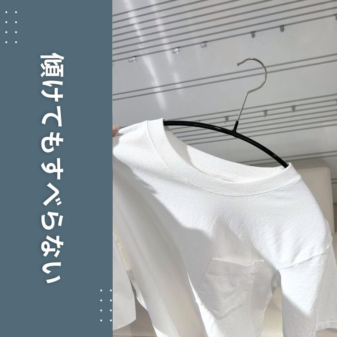 【すべらない】スチール製のハンガー本体はPVC樹脂で特殊コーティングが施され、掛けた衣類が滑り落ちません。人体のラインに合わせた立体構造のため、滑り落ちやすいカーディガンやニットも型崩れなく収納できます。