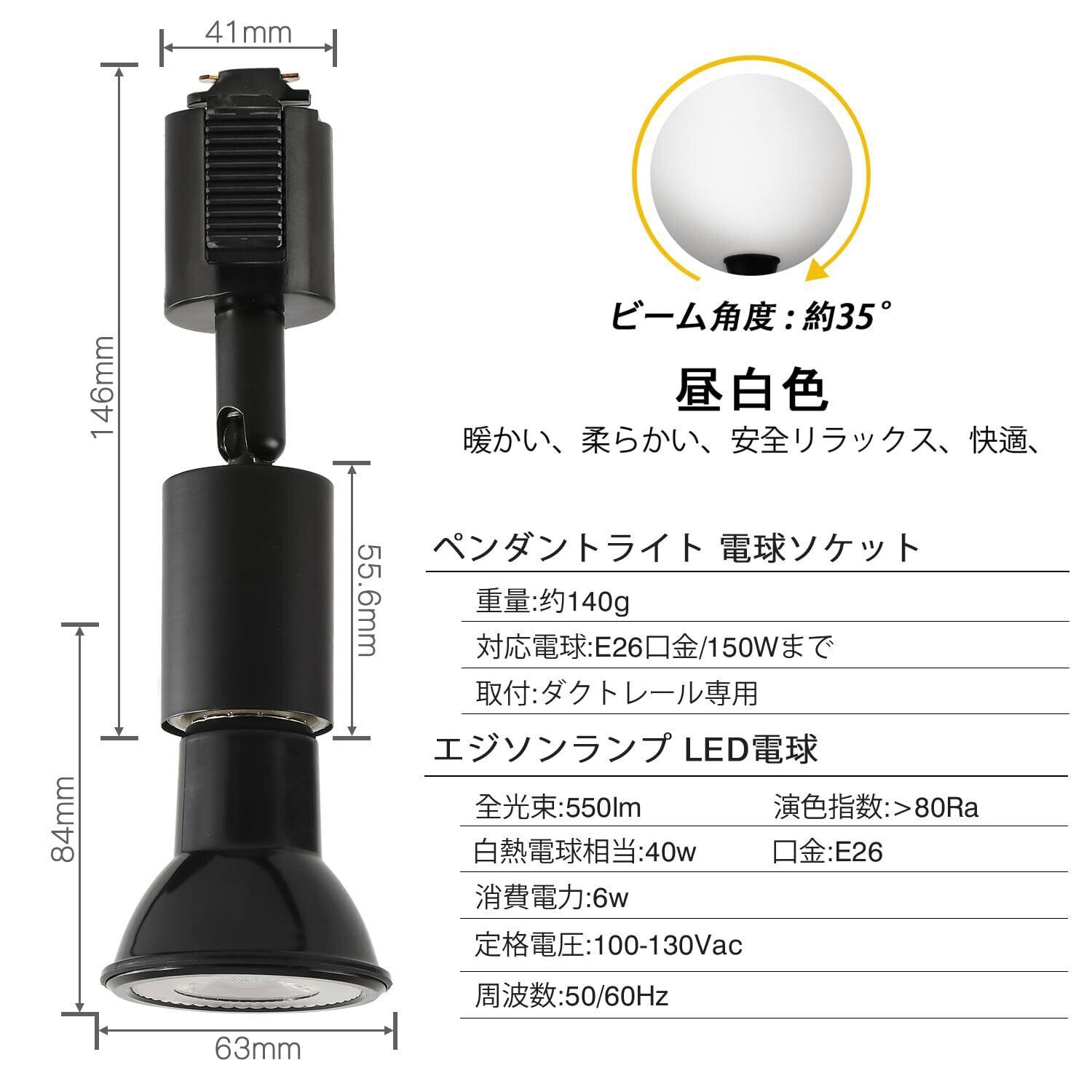 【商品情報】◉器具仕様:E26口金、可動範囲:上下約90度、回転約350度、使用可能電球は口金E26 150Wまで(重量200gまで) ◉LED電球仕様:E26口金、全光束550LM、消費電力6W(40Wハロゲン電球相当)、5000K(昼白色相当)、サイズは約63×84mm、調光対応不可、ビーム角度は35° ◉パッケージ:6灯セット、説明書